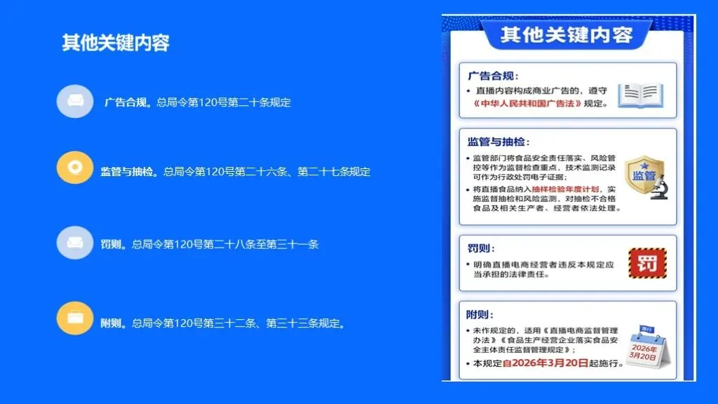 五是全周期强化监管支撑。总局令第120号要求市场监管部门将直播经营食品纳入到日常的监管和年度抽检计划中,明确技术监测记录可以作为行政处罚的电子数据证据。