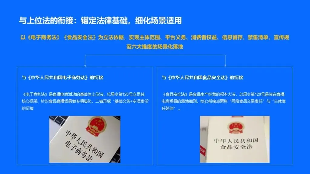 三是回应社会关切与上位法要求,筑牢食品安全底线。食品安全事关人民群众身体健康和生命安全,直播电商食品乱象持续引发社会广泛关注,规范直播电商食品经营行为、强化主体责任落实的社会诉求日益强烈。从法律层面,《食品安全法》《电子商务法》等上位法对食品经营、平台责任等作出了原则性规定,但需要结合直播电商的新业态、新特点细化具体要求,确保法律规定落地见效。为此,市场监管总局针对食品直播领域的突出问题,在梳理实践经验、广泛征求意见的基础上,专门制定总局令第120号,通过明确责任主体、划定禁售红线、规范经营行为、强化监管措施,构建适配直播电商业态的食品安全监管体系,填补现有监管空白。