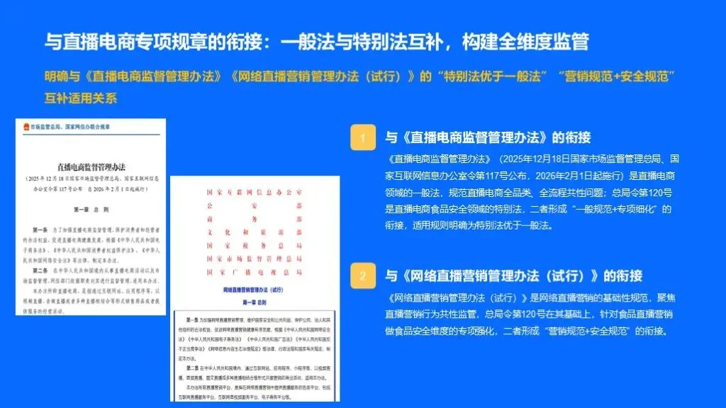 营销规范→安全规范 | 《网络直播营销管理办法》为营销基础规范,《食品安全规定》为安全专项规范 | 二者互补适用,安全规范强化营销规范 | 直播营销需同时满足内容合规与食品安全双重要求,平台需建立“营销+安全”双重审核机制 |