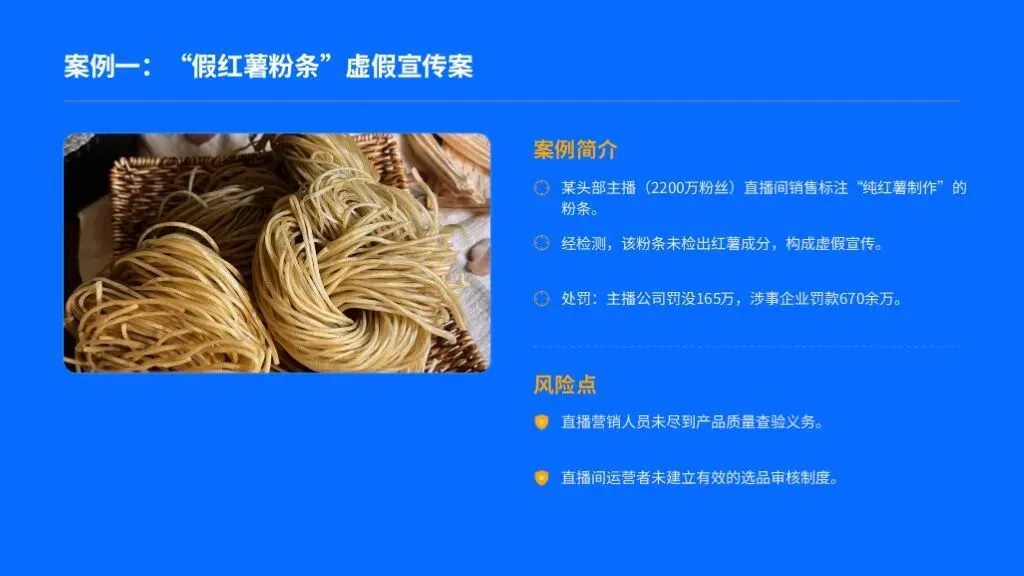 1. 案例简介:某拥有2200万粉丝的主播,在直播间销售一款标注“纯红薯制作”的粉条。经检测,该粉条未检出红薯源性成分,构成虚假宣传。最终,主播所在公司被没收违法所得并罚款共计165万元,责令暂停经营、限期整改;涉事的红薯粉生产企业也被停产停业,没收违法所得并罚款670多万元。
