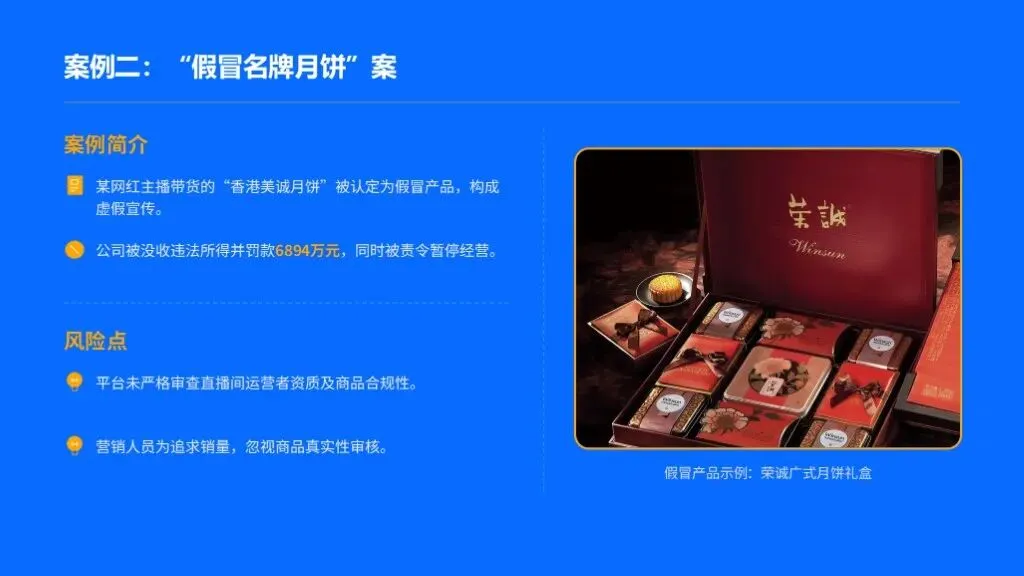1. 案例简介:某网红主播带货的香港美诚月饼经相关部门调查通报,认定构成虚假引人误解的商业宣传。该主播所在的公司因此被没收违法所得,罚款6894万元,并被责令暂停经营,限期整改。