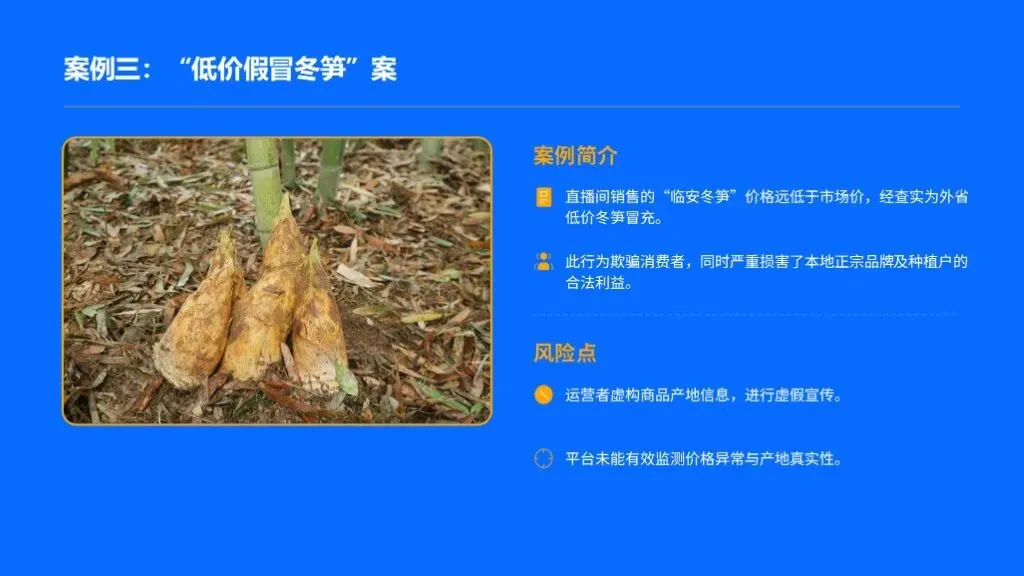 1. 案例简介:直播间销售的临安冬笋平均价格在每斤10元左右,但临安当地种植大户称这个价格根本不够成本。今年临安冬笋产地每斤收购价在20元左右,且因冬季干旱少雨,实际冬笋产量根本不足以支撑网络直播间面向全国大量销售。经调查,一些直播商家将外省低价冬笋拉到临安,冒充临安本地冬笋在直播间加价出售。