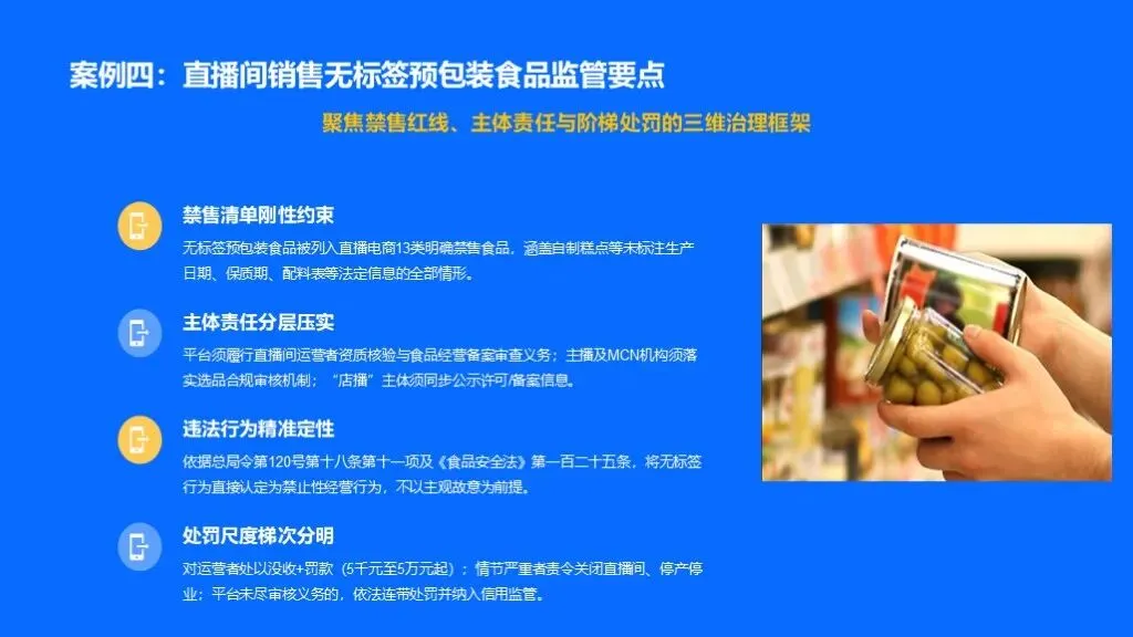 1.案例简介:某主播在直播间销售自制糕点,该糕点无生产日期、保质期、配料表等标签信息。经监管部门核查,该直播间未办理食品经营备案,所售糕点属于无标签预包装食品,违反总局令第 120号第十八条第11项规定。最终,直播间被责令关闭,运营者被罚款5万元,平台因未尽审核义务被连带处罚2万元。