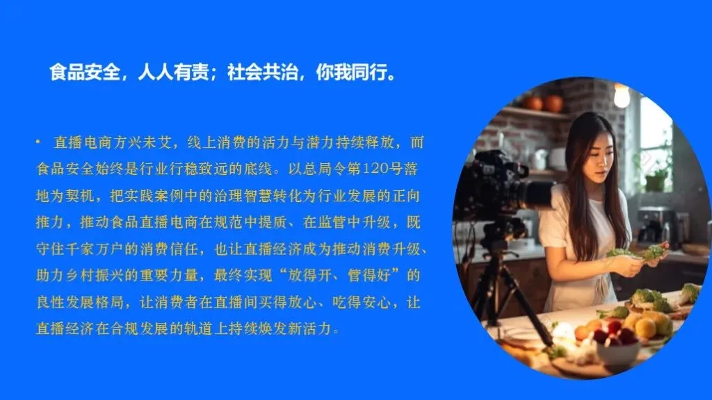 直播电商方兴未艾,线上消费的活力与潜力持续释放,而食品安全始终是行业行稳致远的底线。以总局令第120号落地为契机,把实践案例中的治理智慧转化为行业发展的正向推力,推动食品直播电商在规范中提质、在监管中升级,既守住千家万户的消费信任,也让直播经济成为推动消费升级、助力乡村振兴的重要力量,最终实现“放得开、管得好”的良性发展格局,让消费者在直播间买得放心、吃得安心,让直播经济在合规发展的轨道上持续焕发新活力。