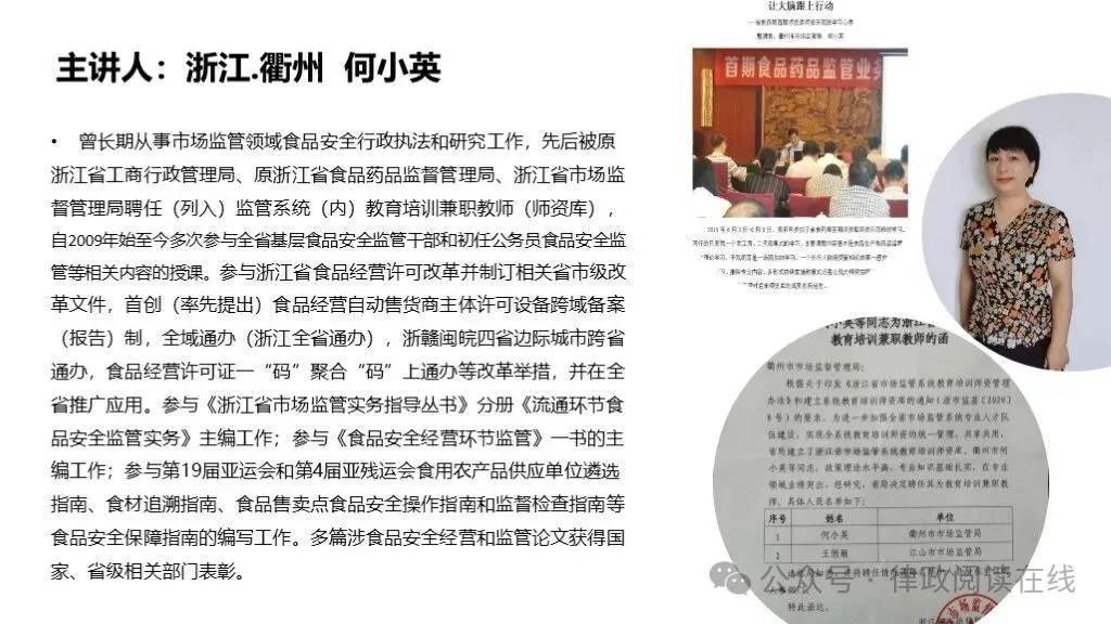 曾长期从事市场监管领域食品安全行政执法和普法的研究工作,先后被原浙江省工商行政管理局、原浙江省食品药品监督管理局、浙江省市场监督管理局聘任(列入)监管系统内教育培训兼职教师(师资库),自2009年始至今多次参与全省基层食品安全监管干部和初任公务员食品安全监管等相关内容的授课。参与浙江省食品经营许可改革并制订相关省市级改革文件,首创(率先提出)食品经营自动售货商主体许可设备跨域备案(报告)制,全域通办(浙江全省通办),浙赣闽皖四省边际城市跨省通办,食品经营许可证一“码”聚合“码”上通办等改革举措,并在全省推广应用。参与《浙江省市场监管实务指导丛书》分册《流通环节食品安全监管实务》主编工作;参与《食品安全经营环节监管》一书的主编工作;参与第19届亚运会和第4届亚残运会食用农产品供应单位遴选指南、食材追溯指南、食品售卖点食品安全操作指南和监督检查指南等食品安全保障指南的编写工作。多篇涉食品安全经营和监管论文获得国家、省级相关部门表彰。