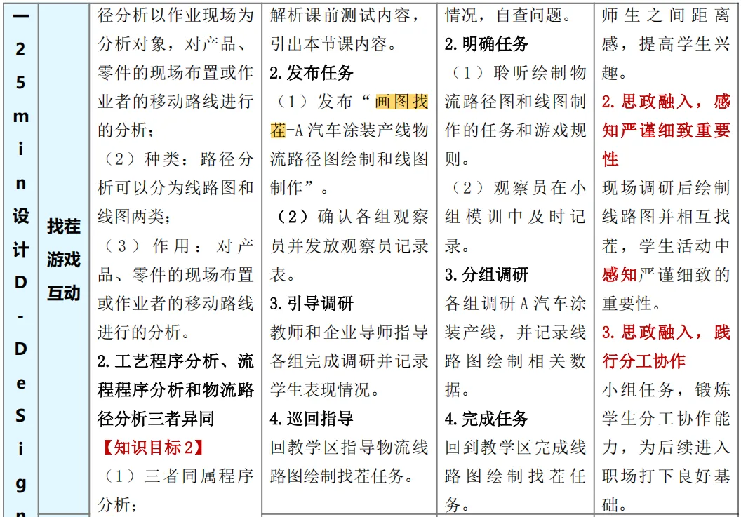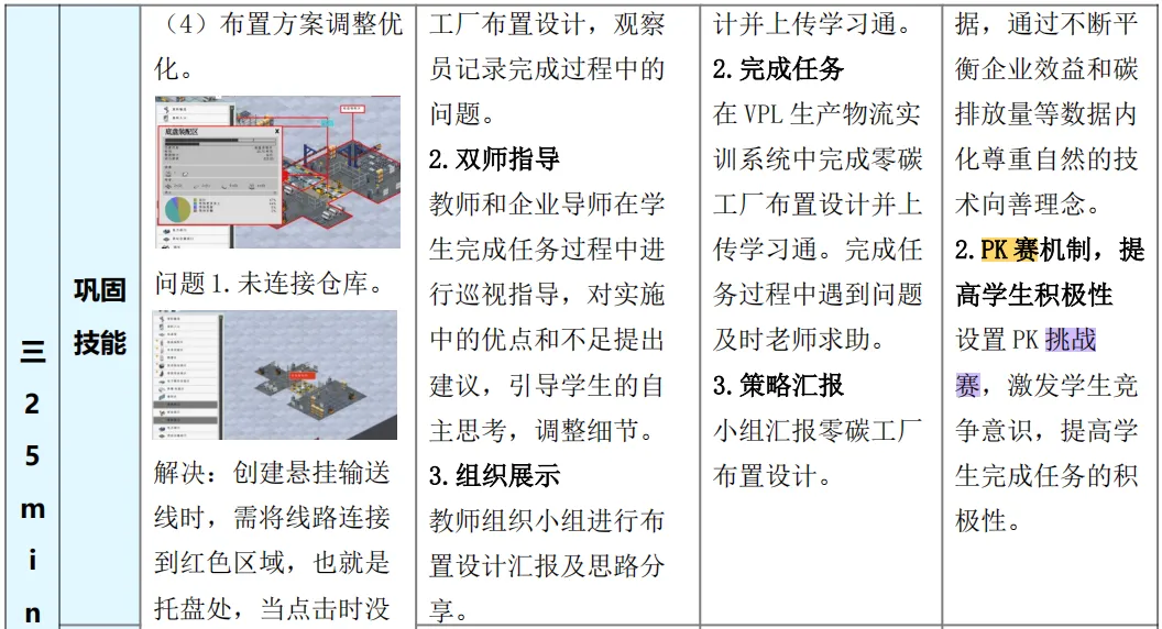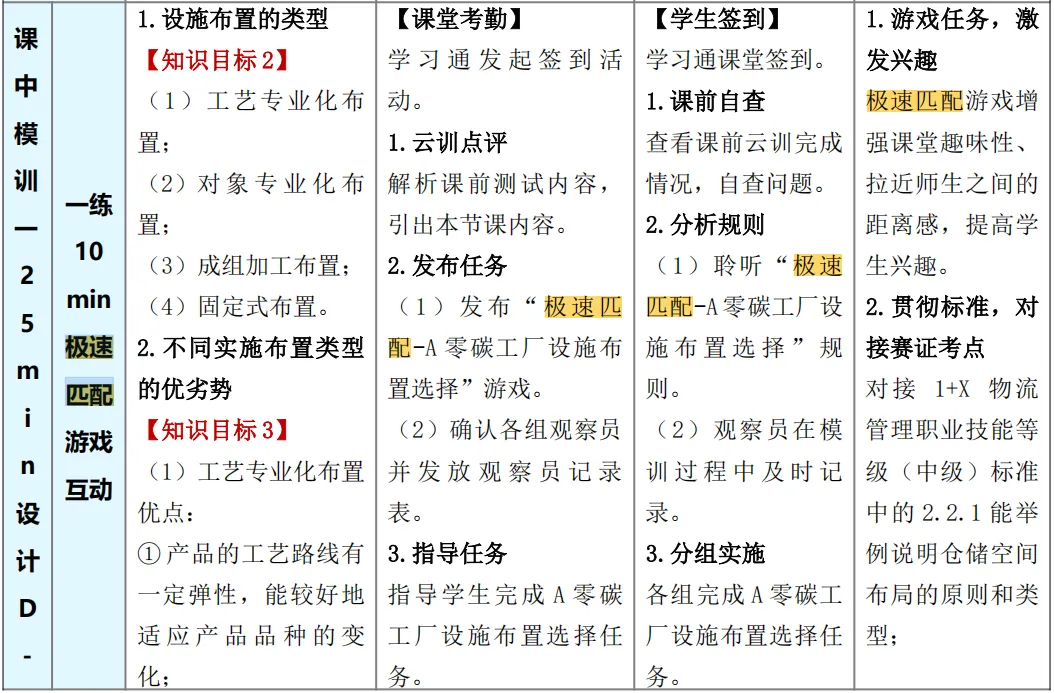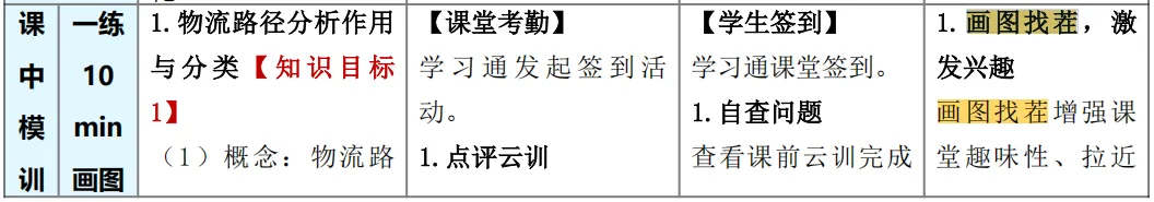 比如《零碳工厂生产物流数智规划与设计》这份教案。首先,它巧妙地把学习变成了游戏。 比如用“极速匹配”这样的小游戏,让学生在紧张的比赛中快速分清不同的工厂布局类型;用“画图找茬”的方式,让学生在趣味中牢记物流路线图的画图规则。