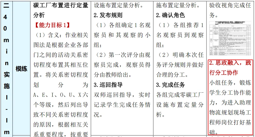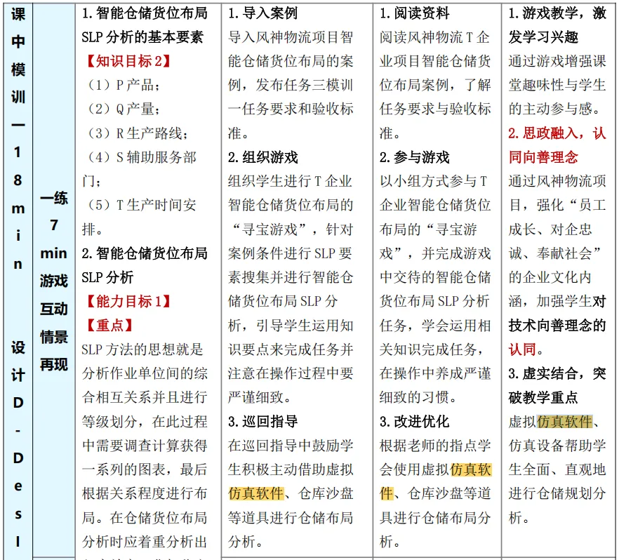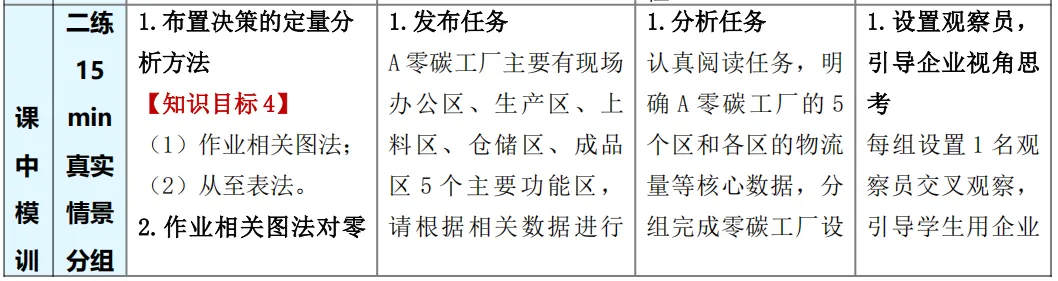 例如《零碳工厂生产物流数智规划与设计》教案在资源准备和使用上很有特点。首先教学不仅使用了国家规划的正规教材来打好知识基础,还补充了学校和企业一起编写的活页教材,内容更贴近实际工作变化。同时,也参考了考取职业资格证书用的教材,让学习内容与行业要求直接挂钩。