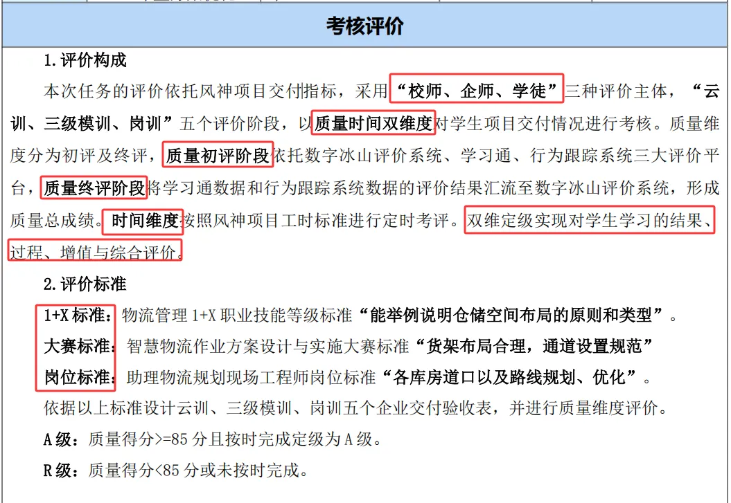 评价标准模仿了企业真实的工作要求,不仅看任务完成得好不好(比如方案设计是否合理、计算是否准确),还特别强调是否“按时完成”,以此培养学生像职业人一样守时、重质的工作习惯。