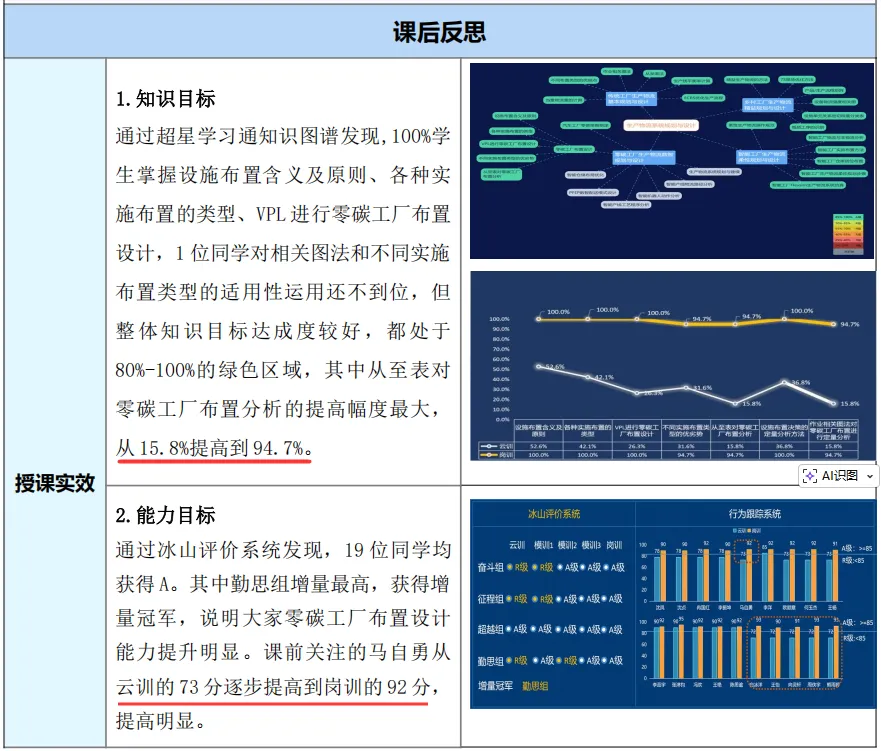 《零碳工厂生产物流数智规划与设计》这份教案的反思不是空泛的谈论,而是用数据说话。通过查看学生在各知识点的掌握情况、系统记录的学习行为与情绪变化等具体数据,来科学地判断教学目标是否达成。例如它能明确指出学生对“从至表”分析方法的掌握率从最初的15.8%大幅提高到了94.7%。