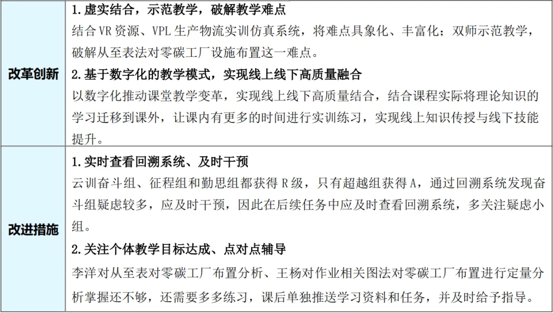 最优秀的是,这种反思和改进已经形成了固定的环节和习惯。教案里专门设置了“改革创新”和“改进措施”两个部分,不仅总结了本次课的优化经验,也为下一次教学如何做得更好指明了方向,真正实现了教学的持续优化和良性循环。