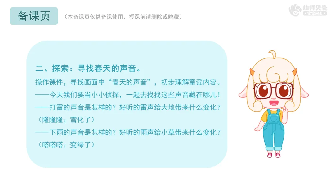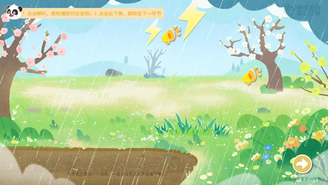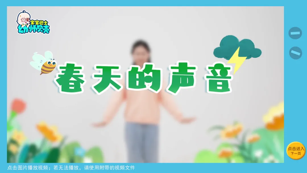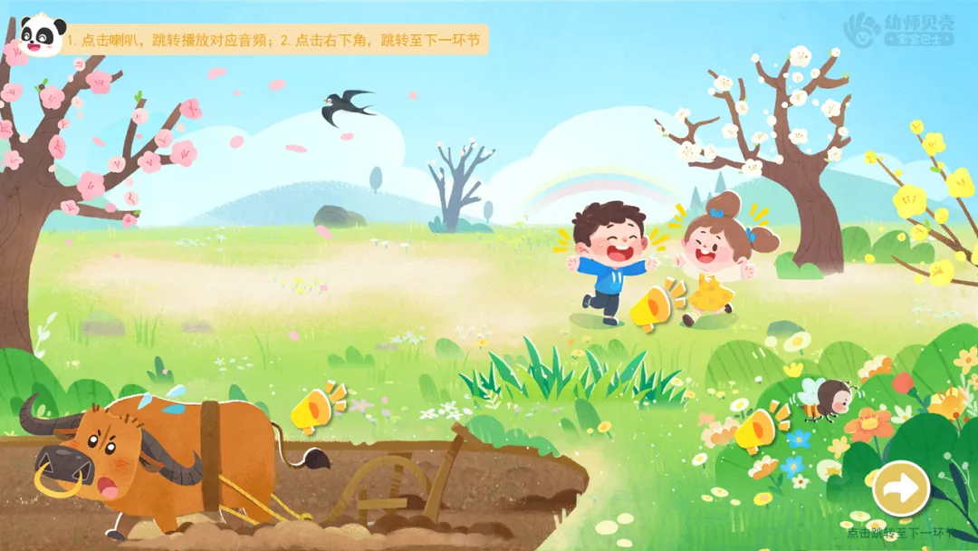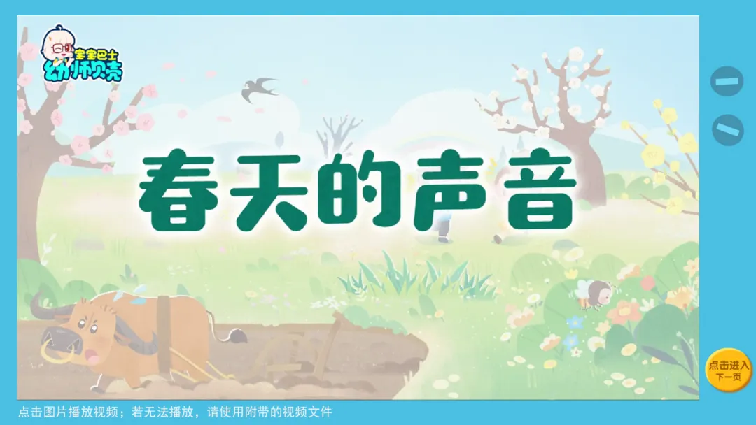 操作课件,寻找画面中“春天的声音”,初步理解童谣内容。