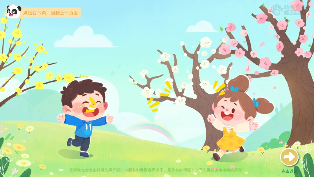 ——还有谁也会发出好听的声音呢?小朋友们看到春天来了,是什么心情呢?(开心得发出哈哈哈的声音)