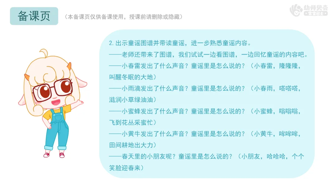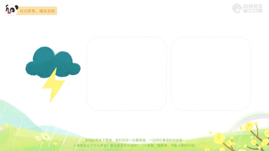 ——小春雷发出了什么声音?童谣里是怎么说的?(小春雷,隆隆隆,叫醒冬眠的大地) ——小雨滴发出了什么声音?童谣里是怎么说的?(小春雨,嗒嗒嗒,滋润小草绿油油)