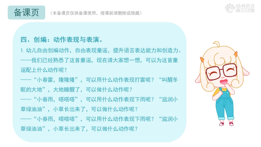 l能模仿童谣中春天的声音,并创编简单动作表现童谣内容。