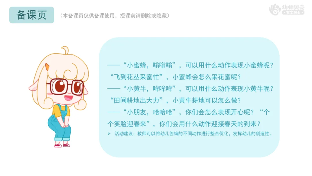 Ø活动建议:教师可以将幼儿创编的不同动作进行整合优化,发挥幼儿的创造性。
