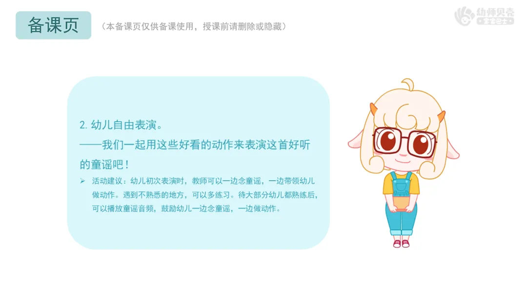 Ø活动建议:幼儿初次表演时,教师可以一边念童谣,一边带领幼儿做动作。遇到不熟悉的地方,可以多练习。待大部分幼儿都熟练后,可以播放童谣音频,鼓励幼儿一边念童谣,一边做动作。