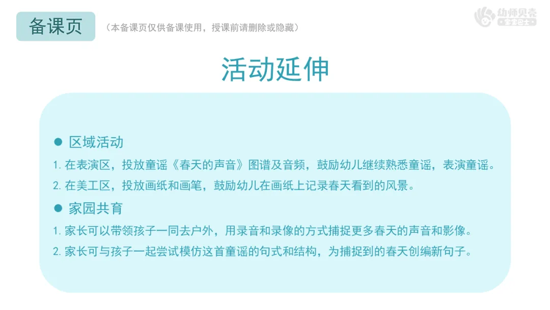 1.家长可以带领孩子一同去户外,用录音和录像的方式捕捉更多春天的声音和影像。 2.家长可与孩子一起尝试模仿这首童谣的句式和结构,为捕捉到的春天创编新句子。