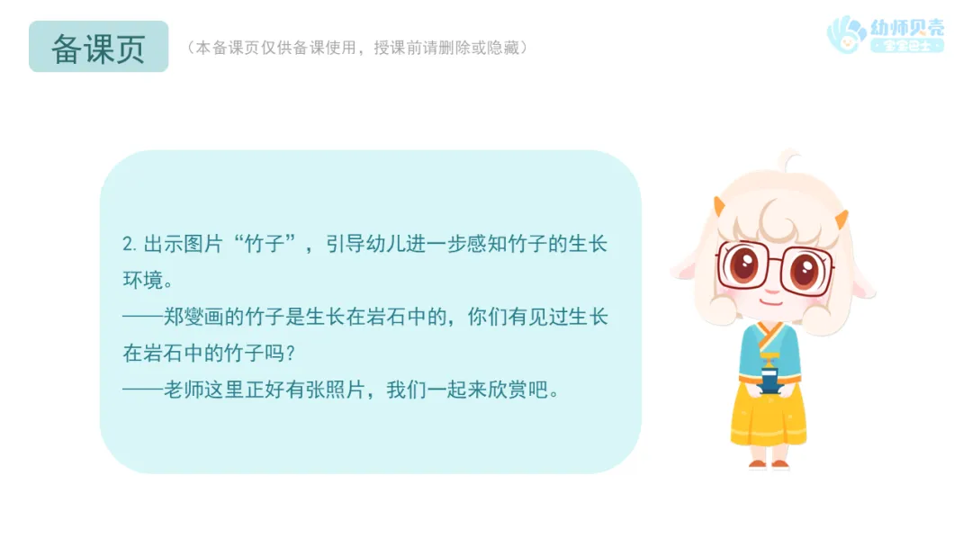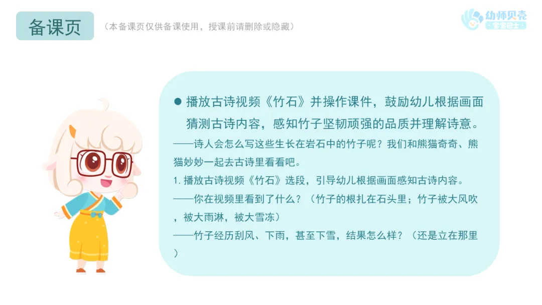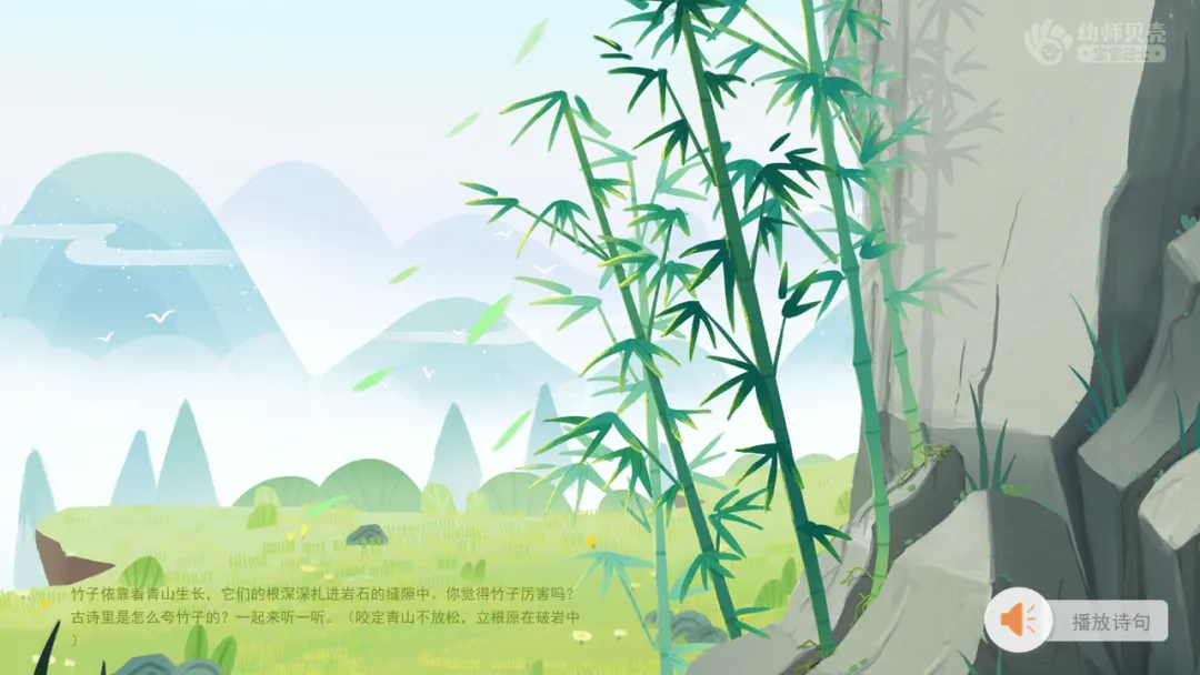 l播放古诗视频《竹石》并操作课件,鼓励幼儿根据画面猜测古诗内容,感知竹子坚韧顽强的品质并理解诗意。