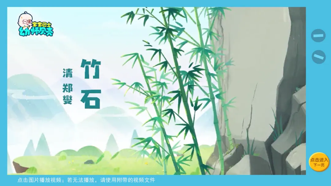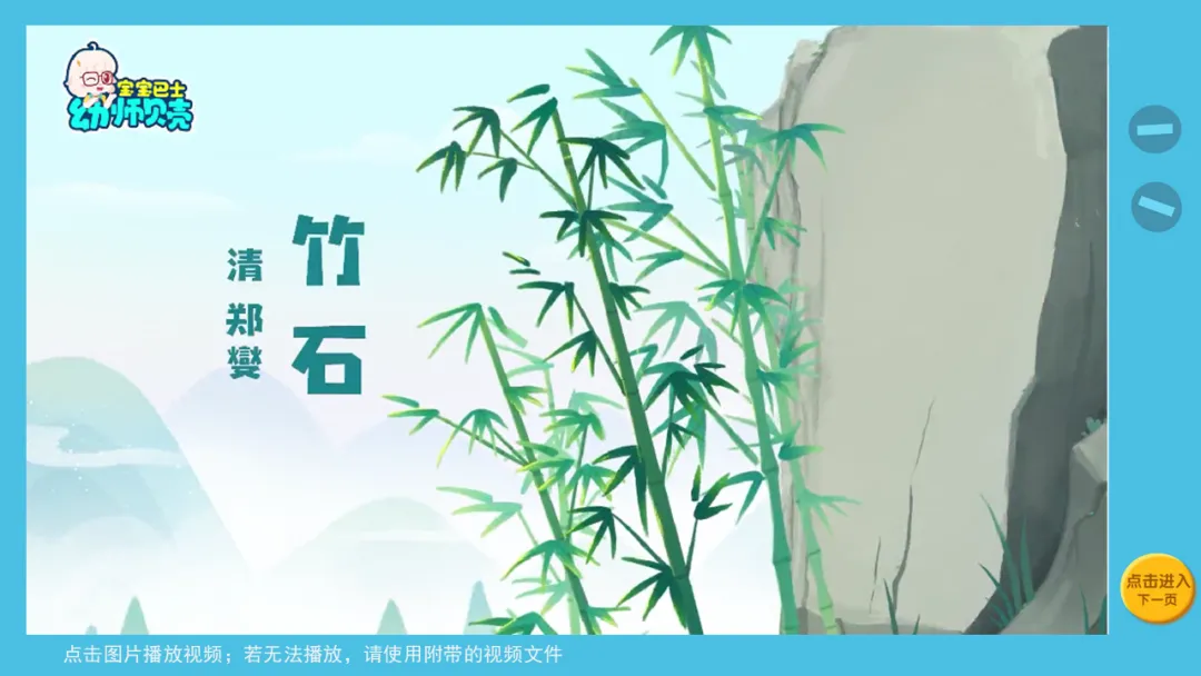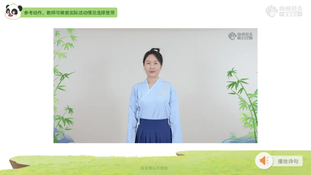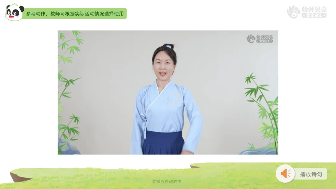 2.播放古诗视频《竹石》念唱版,鼓励幼儿表演并尝试诵读古诗,体验古诗表演的乐趣。