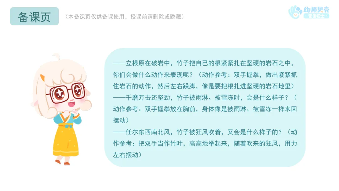 ——诗人赞美竹子坚韧顽强,不怕磨难。我们一起试试用动作把竹子这样的形象表现出来吧。