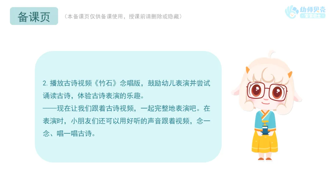 ——现在让我们跟着古诗视频,一起完整地表演吧。在表演时,小朋友们还可以用好听的声音跟着视频,念一念、唱一唱古诗。