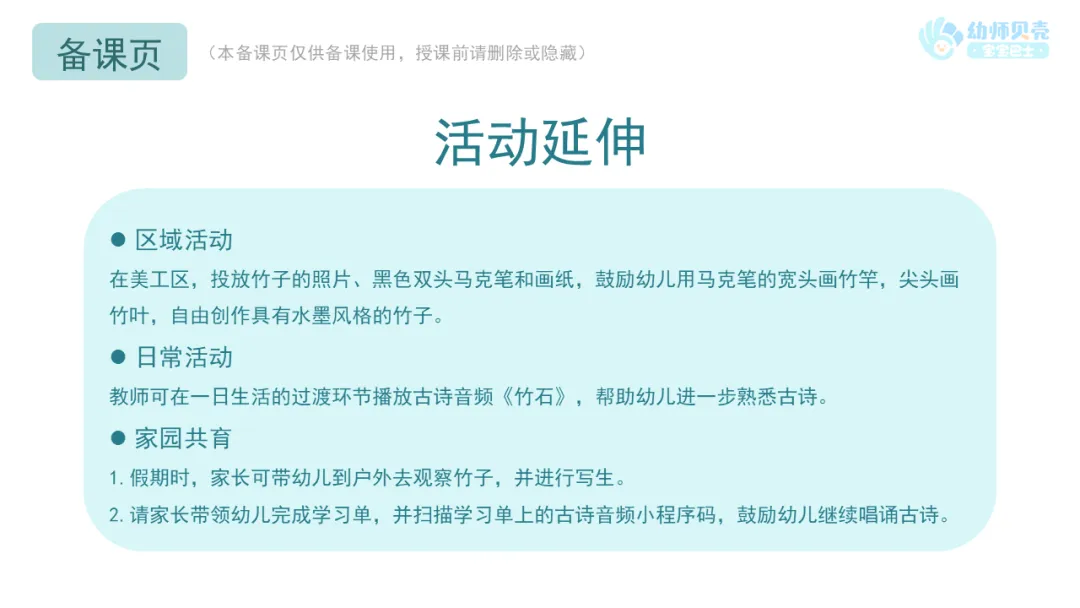 教师可在一日生活的过渡环节播放古诗音频《竹石》,帮助幼儿进一步熟悉古诗。