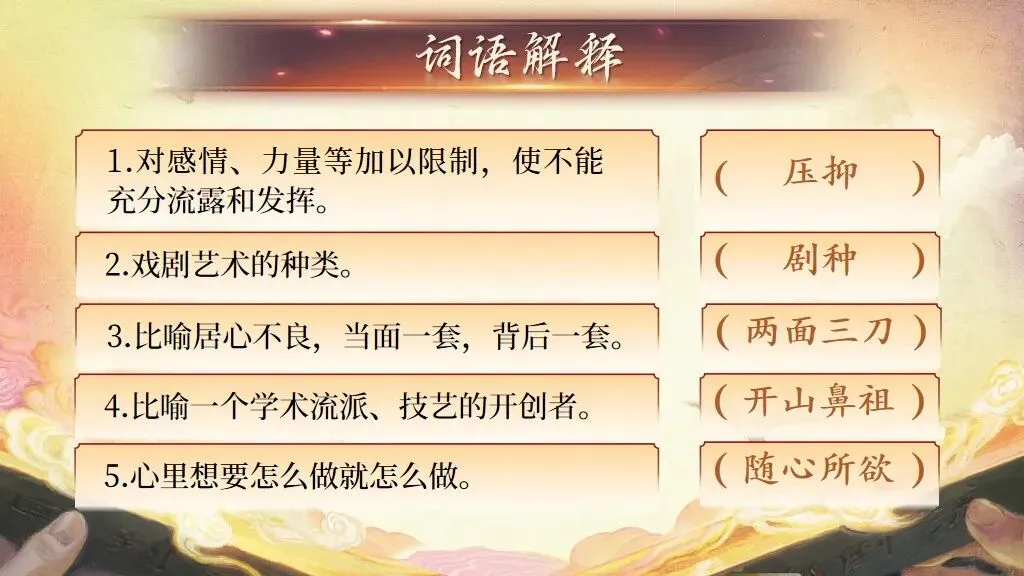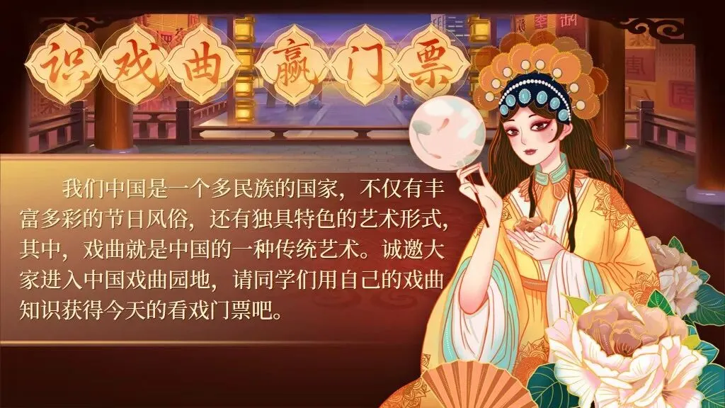 我们中国是一个多民族的国家,不仅有丰富多彩的节日风俗,还有独具特色的艺术形式,其中,戏曲就是中国的一种传统艺术。诚邀大家进入中国戏曲园地,请同学们用自己的戏曲知识获得今天的看戏门票吧。