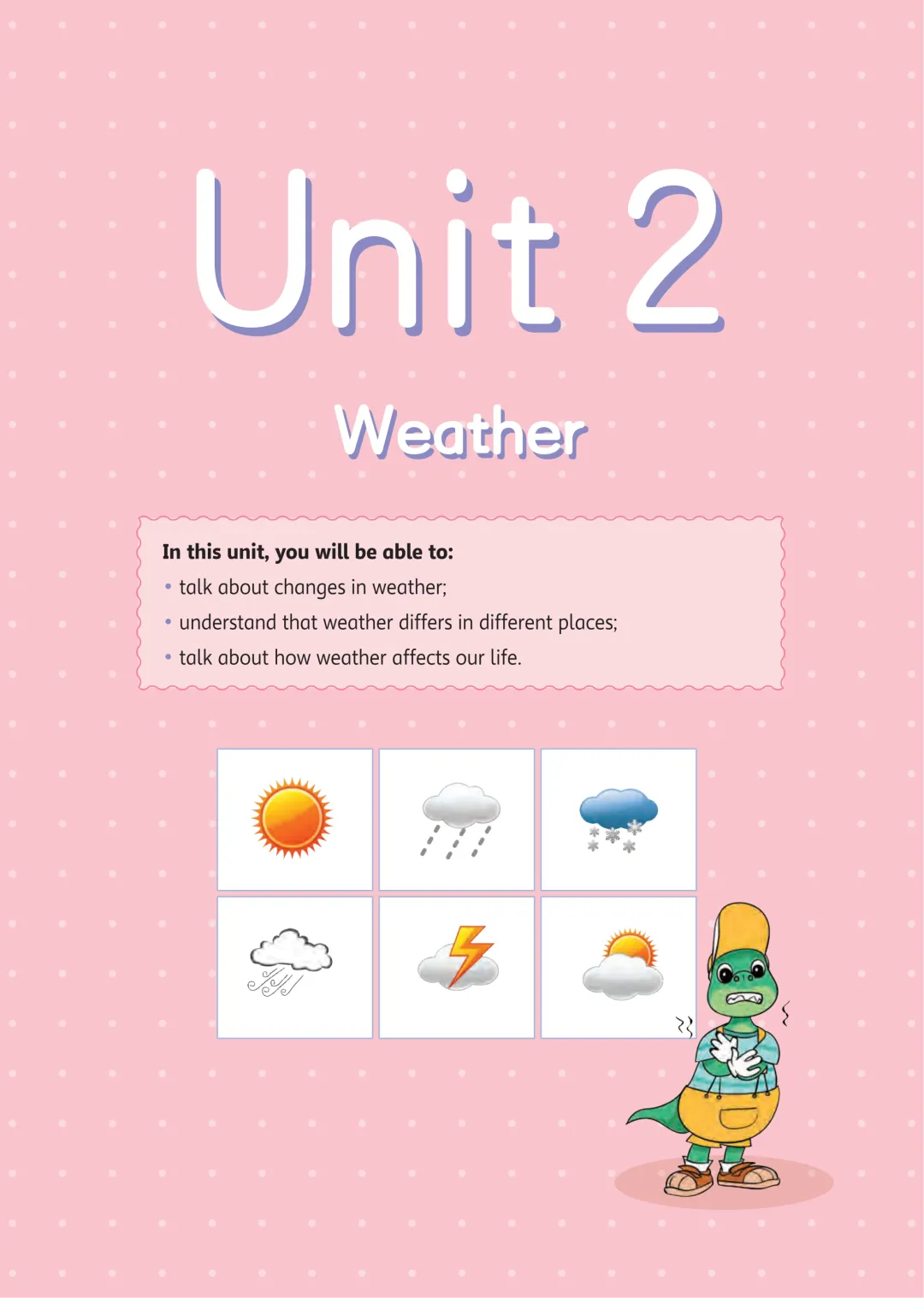 第二单元第四课”So much weather in a day”,这一课的第二版和第一版的主要变化是课本的文本,虽然还是三个时间的三个图,但是时间都发生变化了,在单词表中,第一版只有两个新单词,第二版增加为6个。