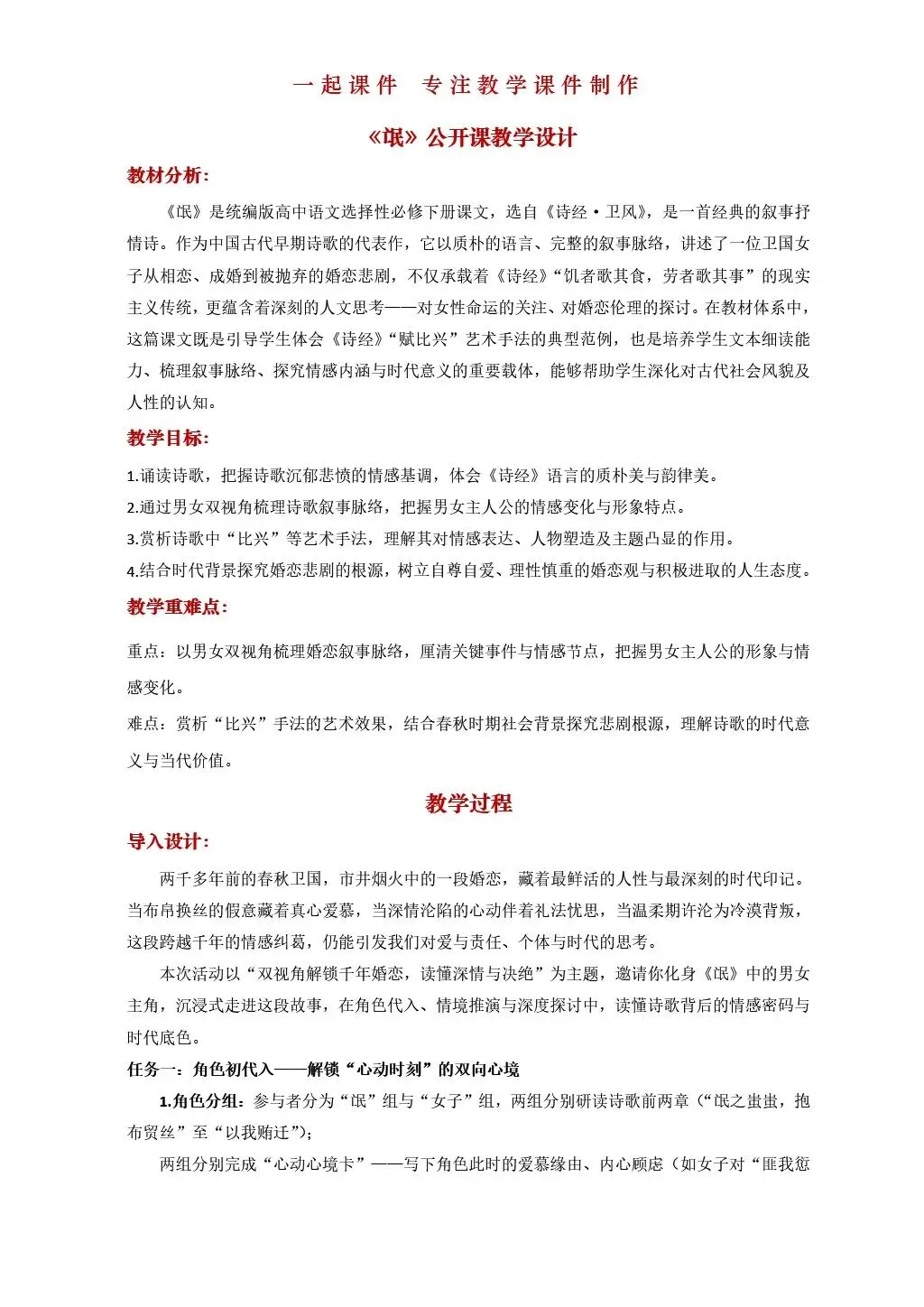 【名师精品公开课系列】| 《氓》:课件+教学设计+导学案