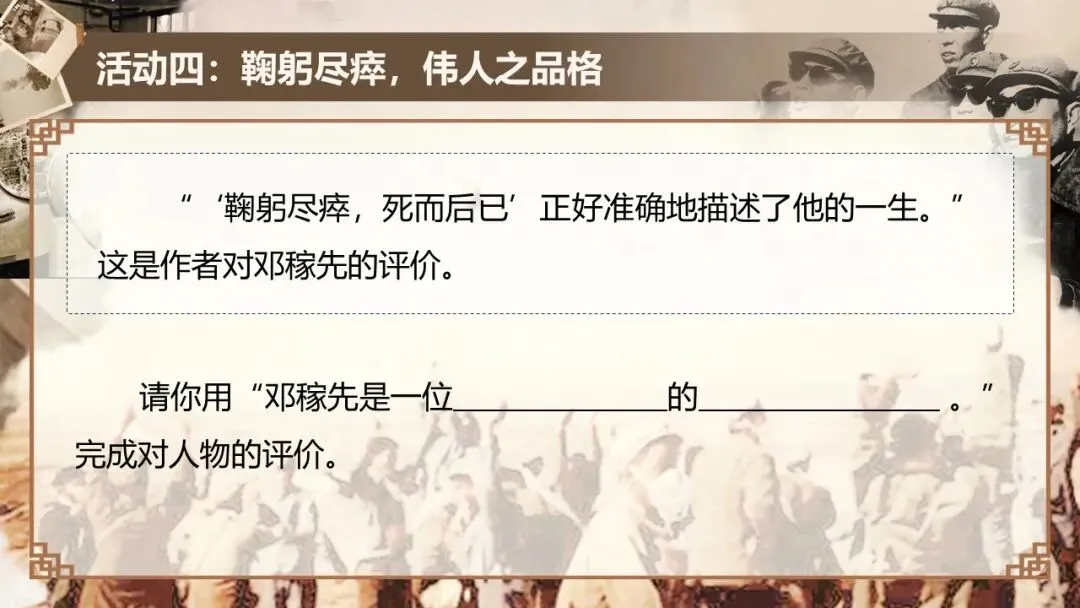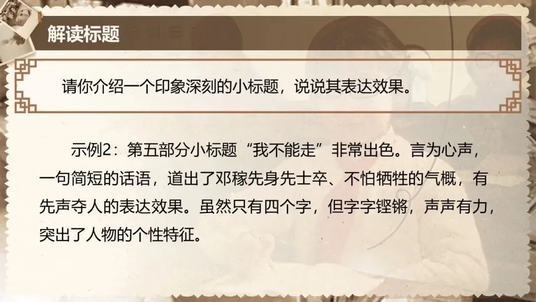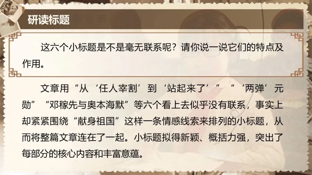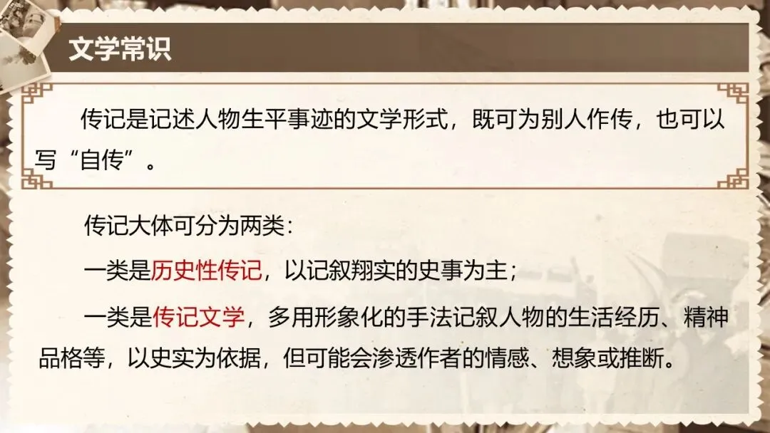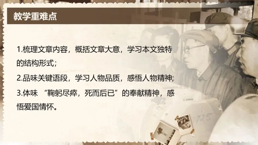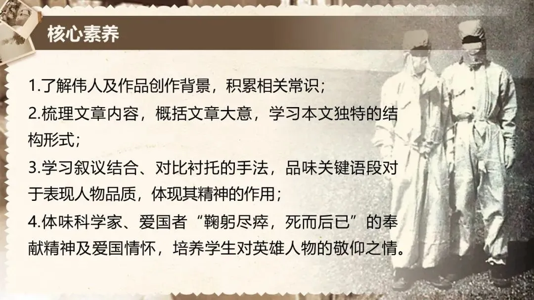 本课是部编版教材七年级下册第一单元的第一篇,文章是一篇颇具时代性的经典篇目,文体为人物传记,所写的人物具有鲜明的时代特征和强大的个人魅力,文中蕴含着百年来的民族情结和文化背景。