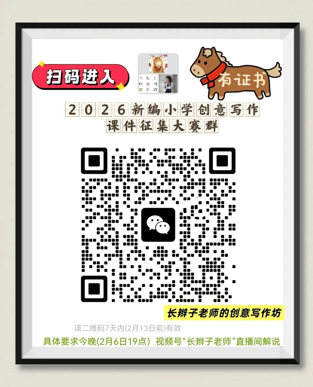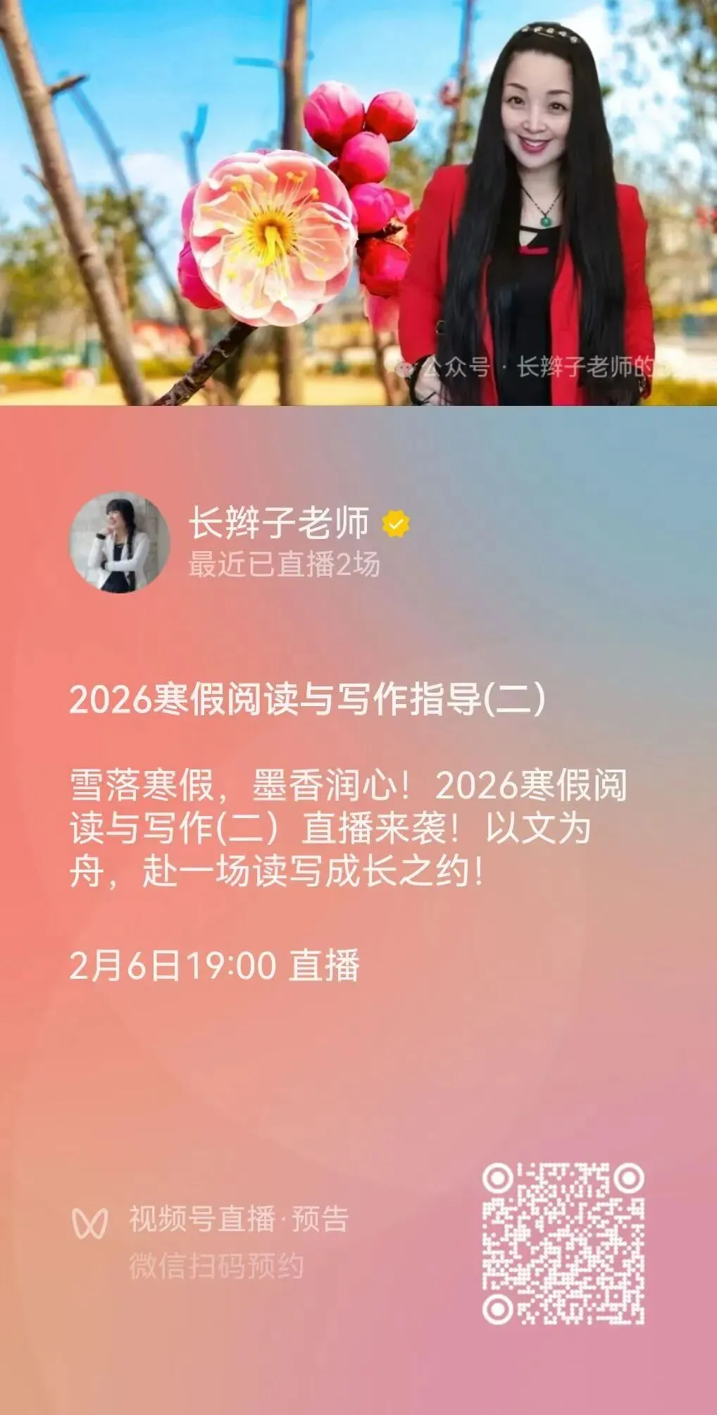 此外,2026寒假刚刚开始,究竟如何让寒假生活真正做到“五丰”,即:丰盈、丰富、丰厚、丰润、丰泽。长辫子老师将于2026年2月6日晚7点,在“视频号”直播,欢迎有兴趣的宝贝们,扫码预约。咱们不见不散!