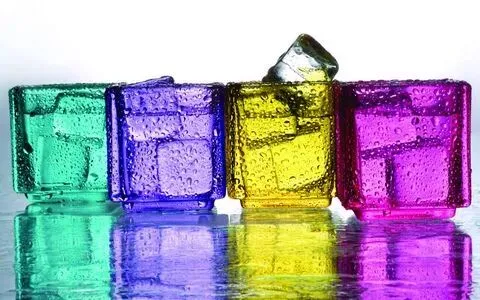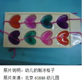 水倒入不同形状的模具里可以制作不同形状的冰块。冰是透明的,将装饰品放入水里冻成冰,就可以透过冰看到里面的饰品。小朋友们在冰格中放入彩色小纸片或豆子之类的东西,再放水,埋一根棉线,冻制成冰串,天冷时可以将冰串悬挂在室外展览。