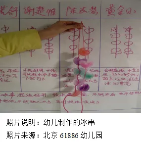 1、展示教师自己制作的冰串,让幼儿猜一猜教师是怎么制作冰串的。