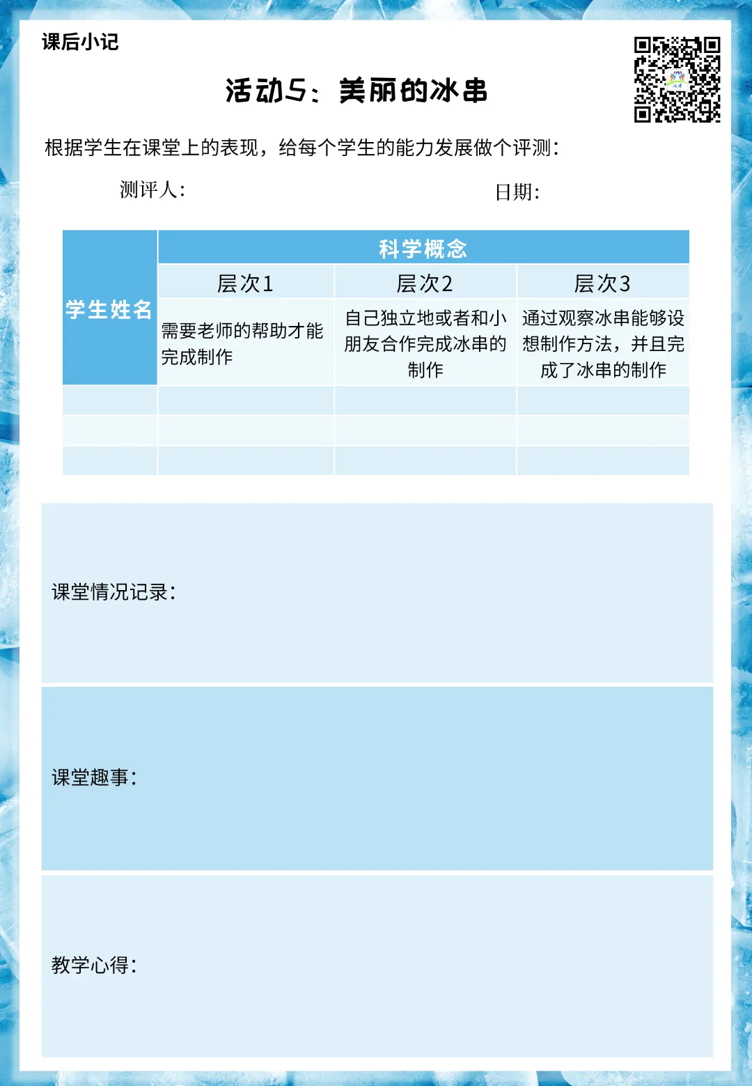 2、教师可以对幼儿制作冰串的过程和冰串进行拍照,贴在幼儿记录单上,并在记录单上对每张照片写上评语和鼓励的话。