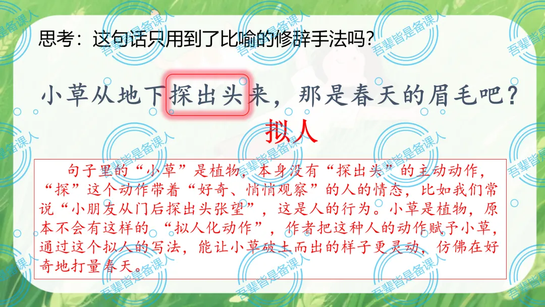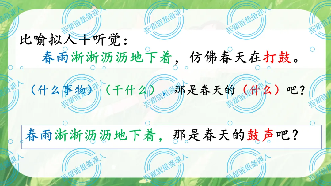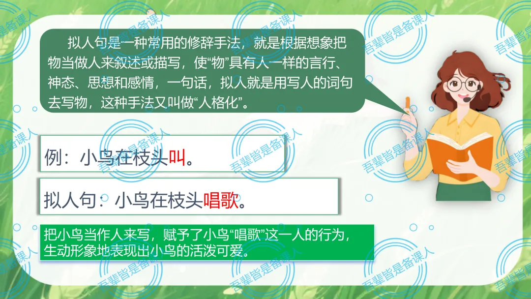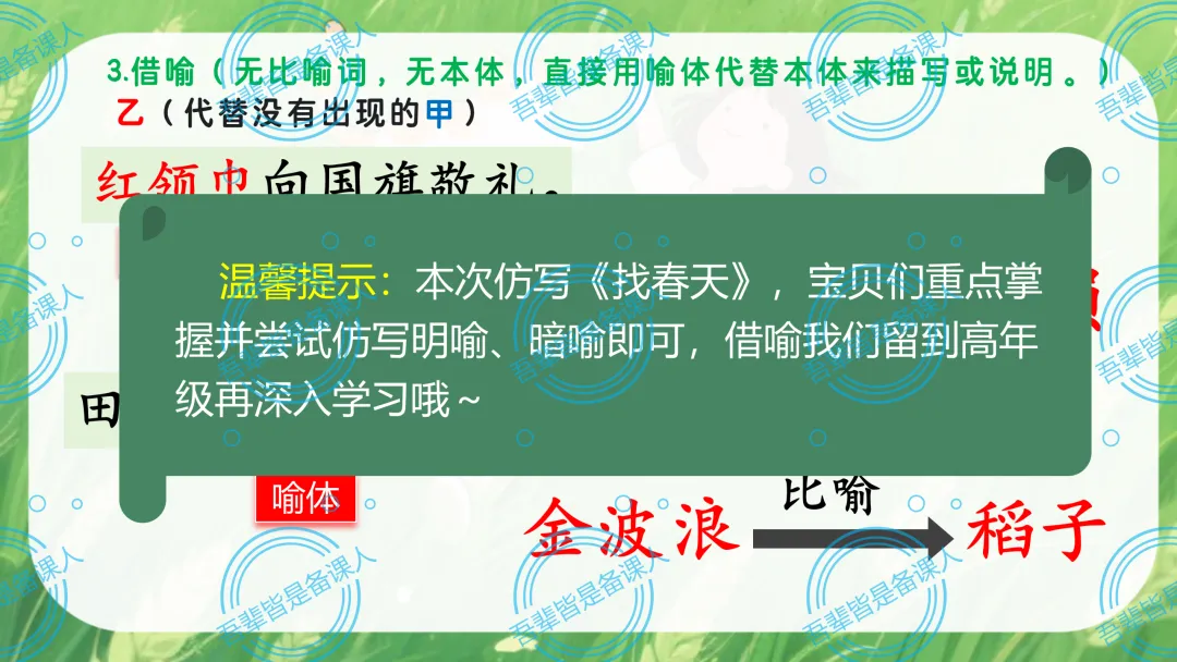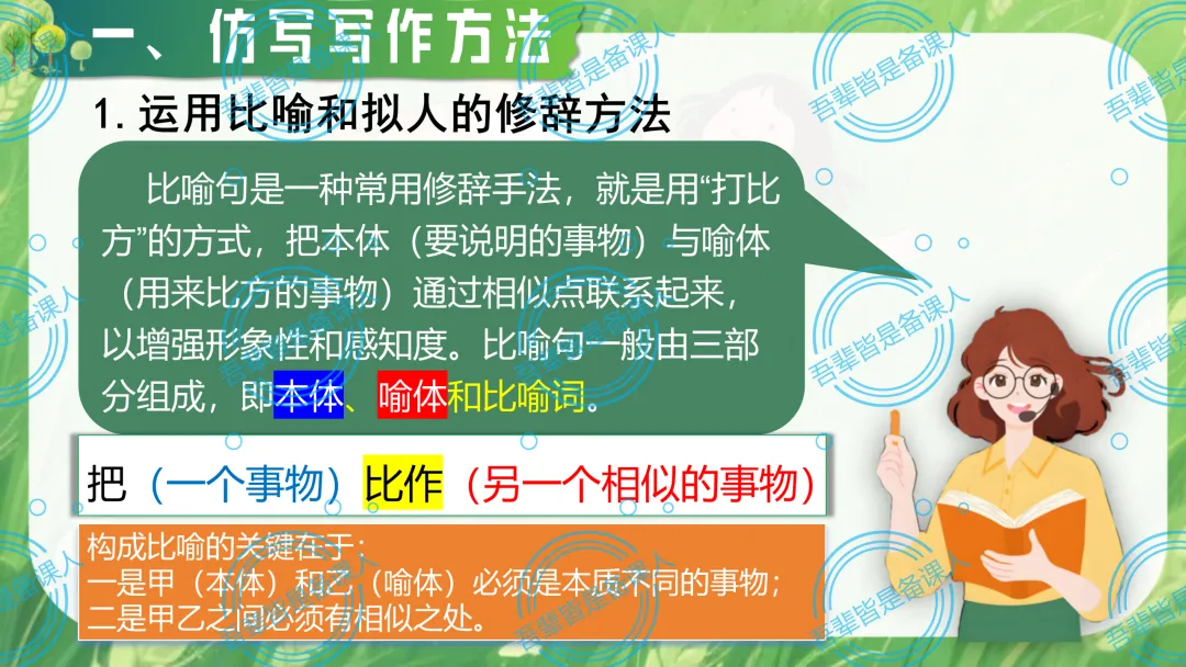 课件包含32页精美可编辑无水印PPT(课件为PPTX格式)+自制参考逐字稿+自制教案+学习单。从细审题、学方法、理思路到说一说、明要求、赏范文,6大模块层层递进。不仅拆解了比喻/拟人修辞、五感写作法的运用技巧,还提供可直接套用的句式模板、好词加油站和完整范文,让学生快速掌握仿写逻辑,写出充满童真的春日写话。 所有资料均为原创打磨,适配统编版教材,拿到就能直接用,帮你节省大量备课时间!喜欢这份课件的老师,赶紧添加我的微信:XBYW9550008882(备注“找春天课件”)有偿获取,早入手早省心,让你的课堂更出彩~