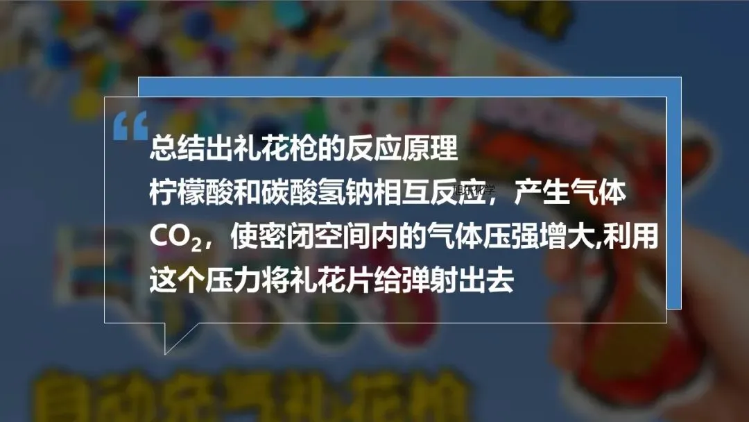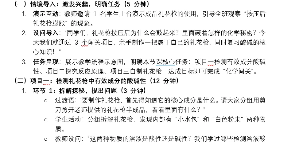 采用项目式教学方式,以"自制礼花枪"为任务驱动,通过检测礼花枪中有效成分的酸碱性、探究礼花枪反应原理、制作礼花枪三个子项目,帮助学生达成学习目标。
