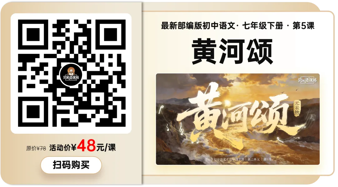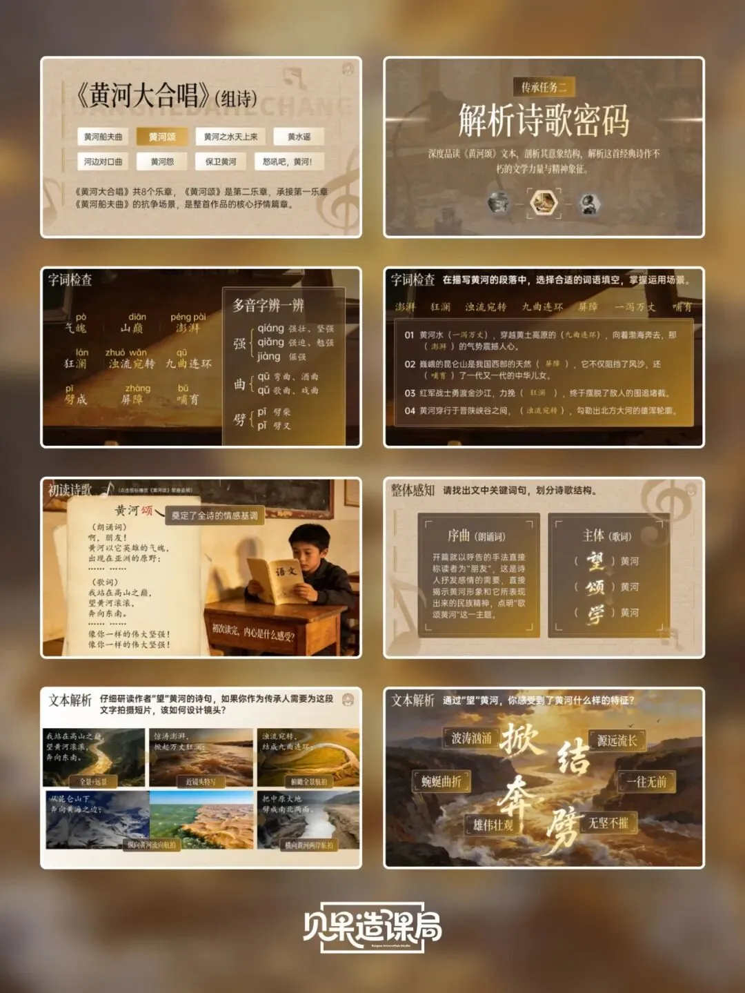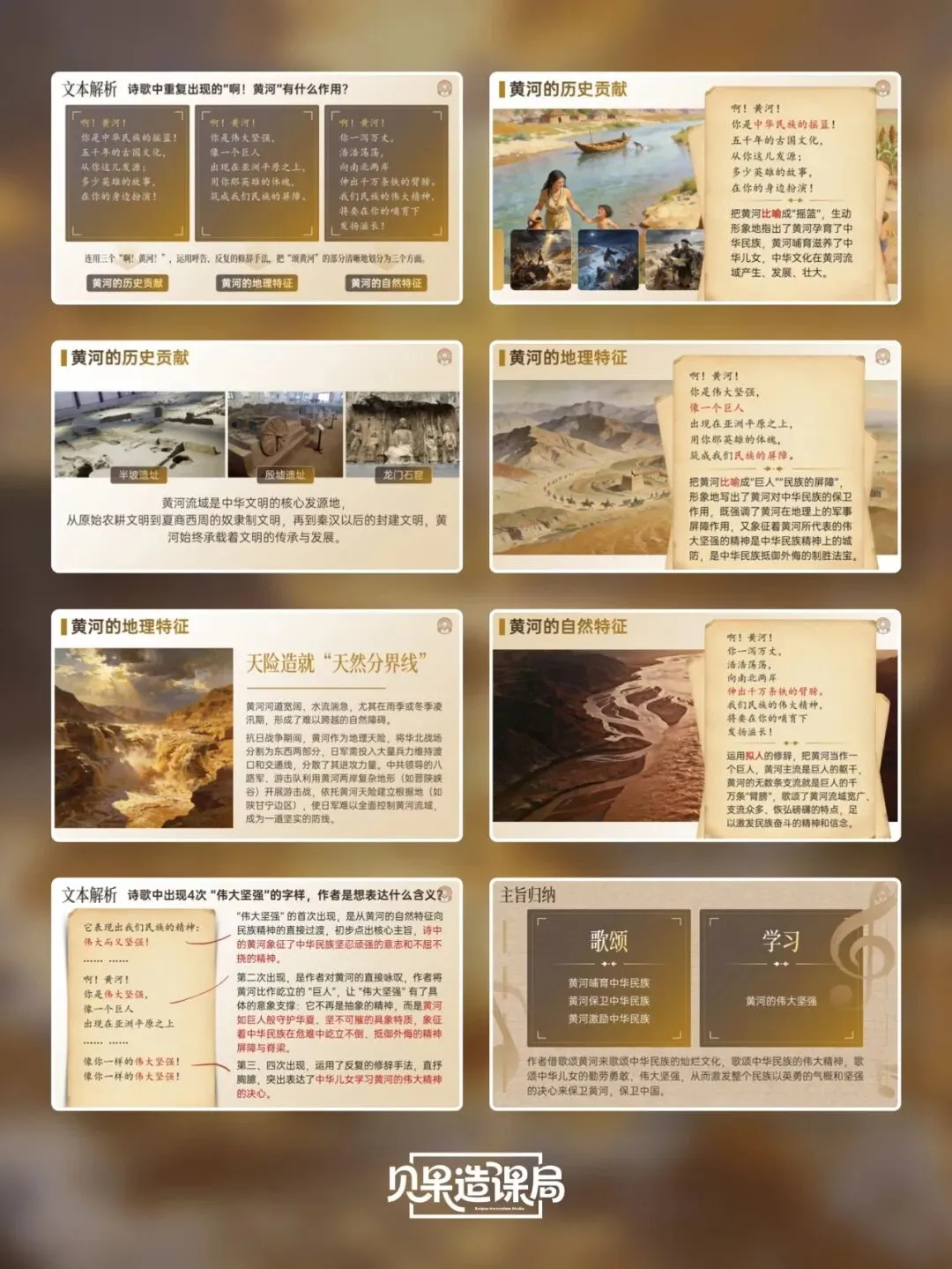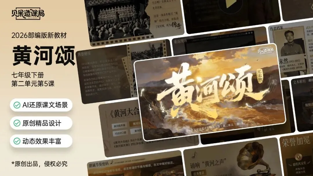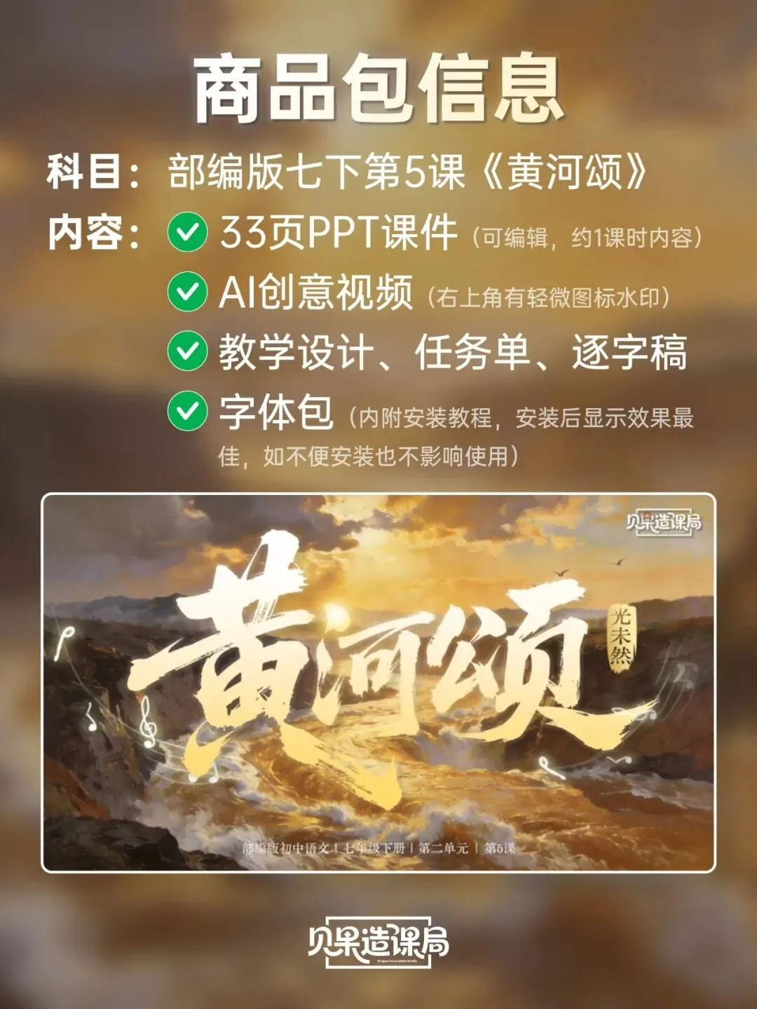 大家好~欢迎关注「贝果造课局」,今日分享部编版·七下语文第5课|《黄河颂》精品课件。本课情境设计:本课以“黄河精神传承人培养计划”为核心线索,学生将化身“传承人”,通过寻访《黄河颂》诞生之源、解析诗歌密码、诵响“黄河之声”三大任务,深入理解诗歌内涵与黄河精神,最终完成诗歌理解、朗诵展示与精神传承。(购买方式在文章末尾)为感谢所有一直支持我们的粉丝朋友们,所有的商品均可先行领券,新老客户可领取不同券额的优惠券!(如之前购买过我们课件,但没有领取老客优惠券成功的,可联系客服核对订单改价)课件如有使用问题,均可联系客服,协助您第一时间解决:bgyw999