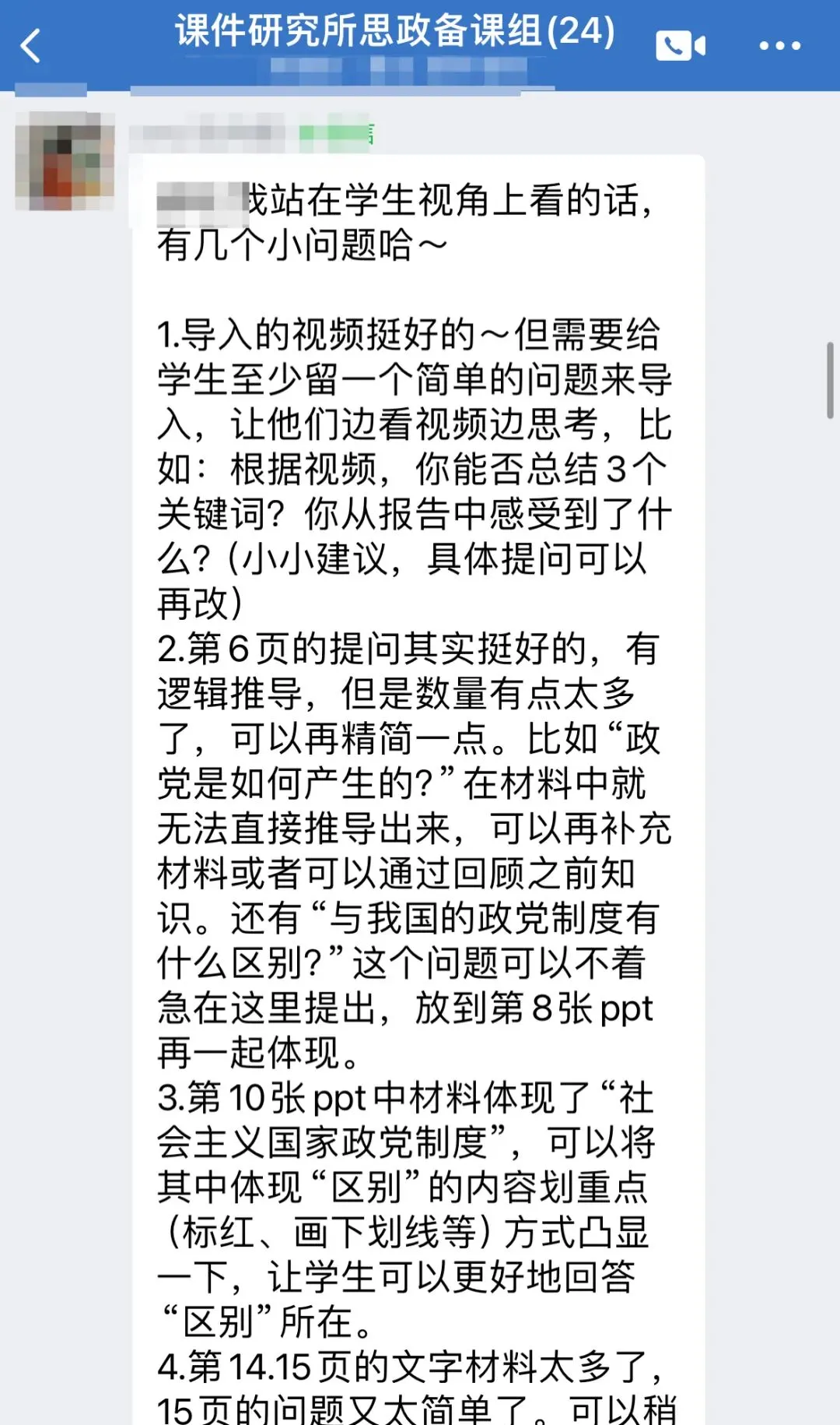 每一个课件初稿完成后,组内会组织一起磨课,制作老师发出课件设计并说明自己的设计意图和设计亮点。群内其它老师会根据课件提出自己的想法,制作老师也会再次完善每一个课件细节👇👇
