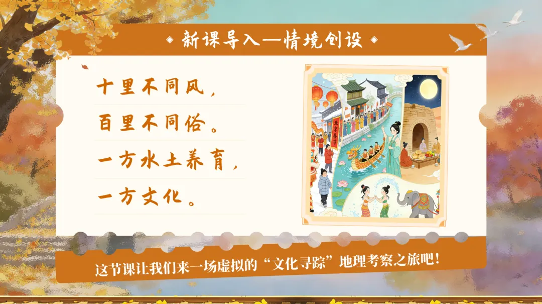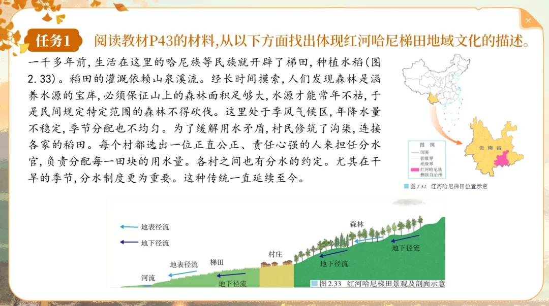 80%课件采用情境设计、案例探究、一境到底的授课思路,围绕情境或案例设置学习任务或问题链,引导学生深度参与地理学习。