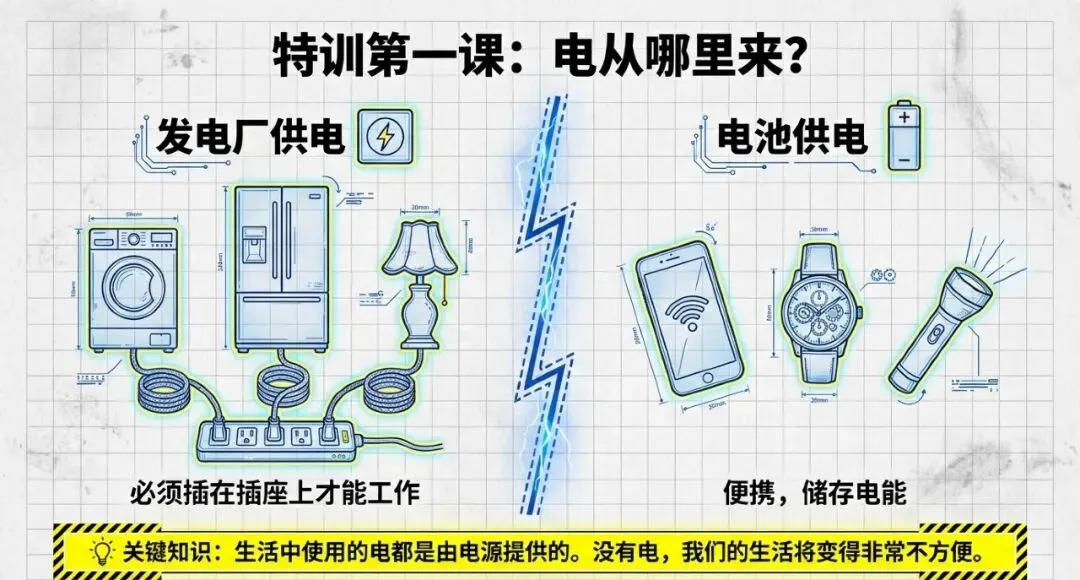 比如在讲电的来源时,它先从发电厂和电池说起,紧接着立刻强调安全,这一点我特别喜欢,把1.5V安全电压和220V危险电压做了极具视觉冲击力的对比,在学生动手之前先打好安全第一的预防针。