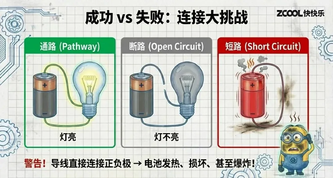 进入核心知识点后,这份课件的视觉化做得相当到位。比如讲通路、断路和短路,它不是光靠嘴说,而是用直观的对比图,尤其是对短路后果的警示,非常震撼。