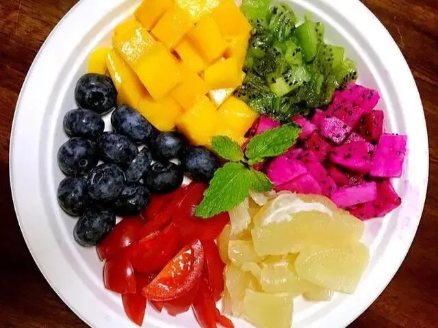 五颜六色的水果拼盘,令人赏心悦目,胃口大开,彩虹有七种颜色,彩虹是气象中的一种光学现象,是气象中的一种光学现象,可以试试用不同的水果,搭配出不同的颜色,操作过程:准备好一个平盘,把芒果、蓝莓、猕猴桃、火龙果、柚子、西红柿洗净,水果切丁摆盘,中间放薄荷叶点缀一下。