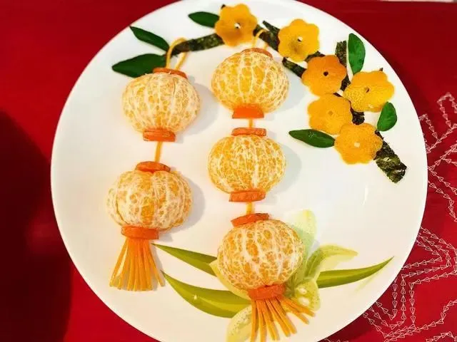 除夕夜的晚上,人们都喜欢悬挂两盏“红灯笼”,来营造一种喜庆的氛围,广为流传,经久不息,直到如今,灯笼饰品依然火爆,为了区分,手艺人还会在上面装饰山水、人物、动物、花鸟等图案,每逢重大节日,处处都有灯笼的身影,操作过程:橘子剥皮,分成两半,用橘子皮和叶片作为点缀。