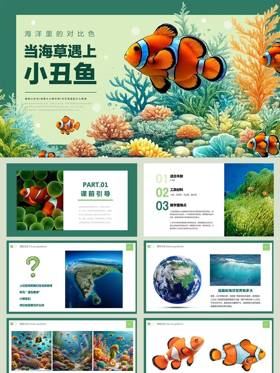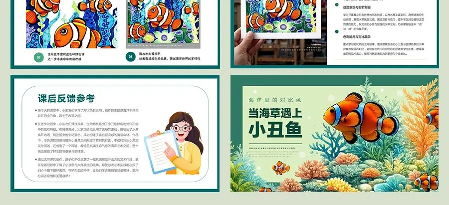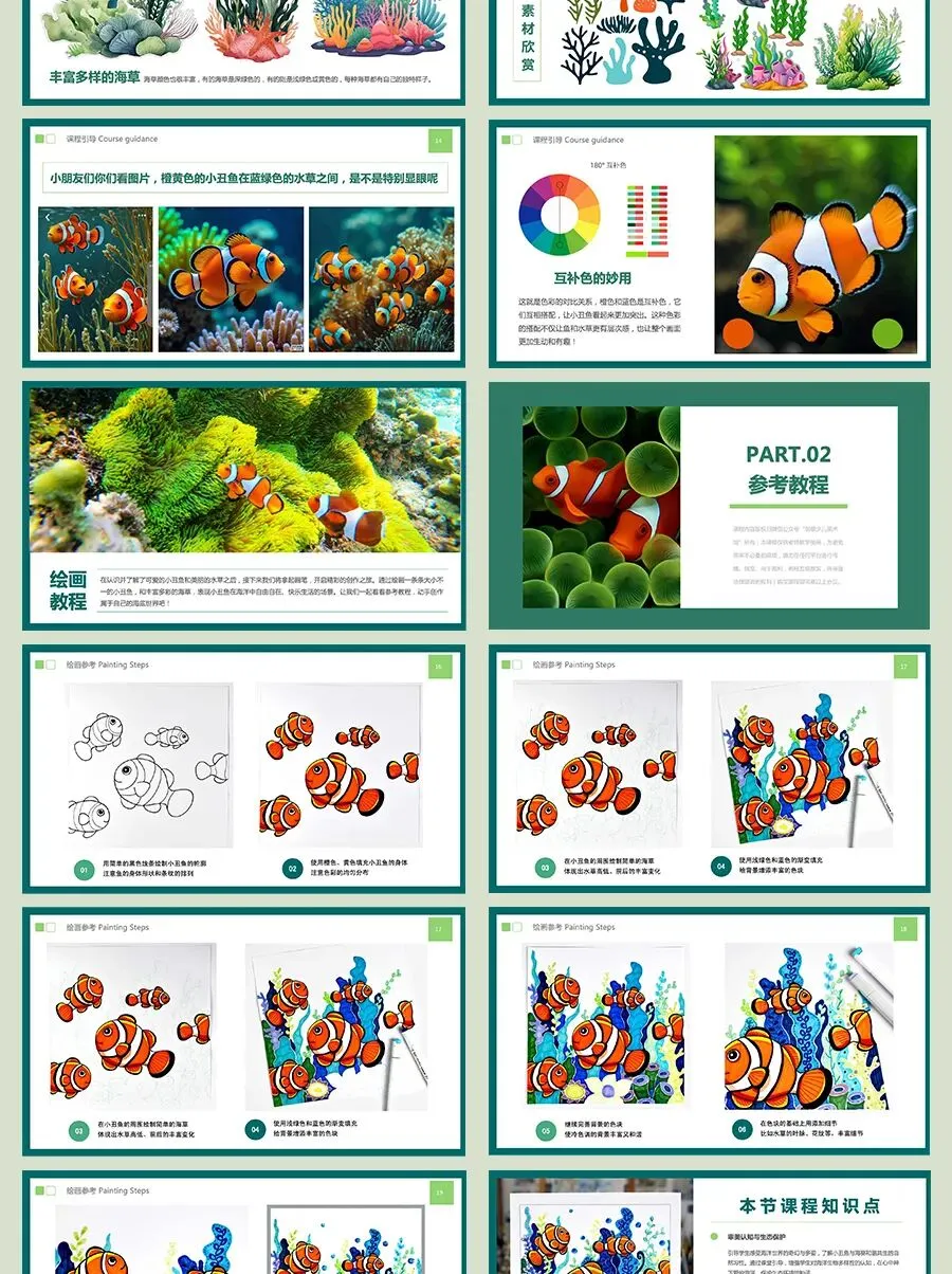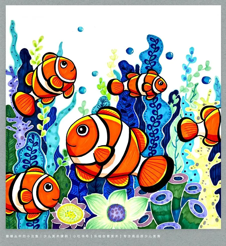 小朋友你们看,小丑鱼身上那明亮的橙黄色,和它周围蓝绿色的海草放在一起,是不是感觉画面特别“跳”、特别醒目?这就是神奇的对比色关系。在今天,我们将学习运用这种奇妙的对比色,画一画海草中的小丑鱼吧!