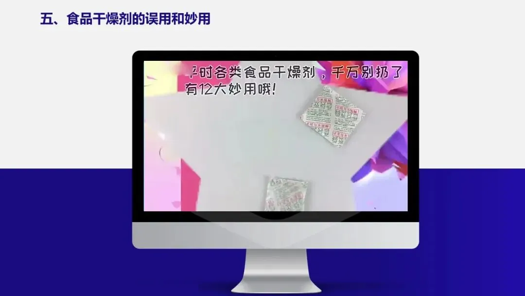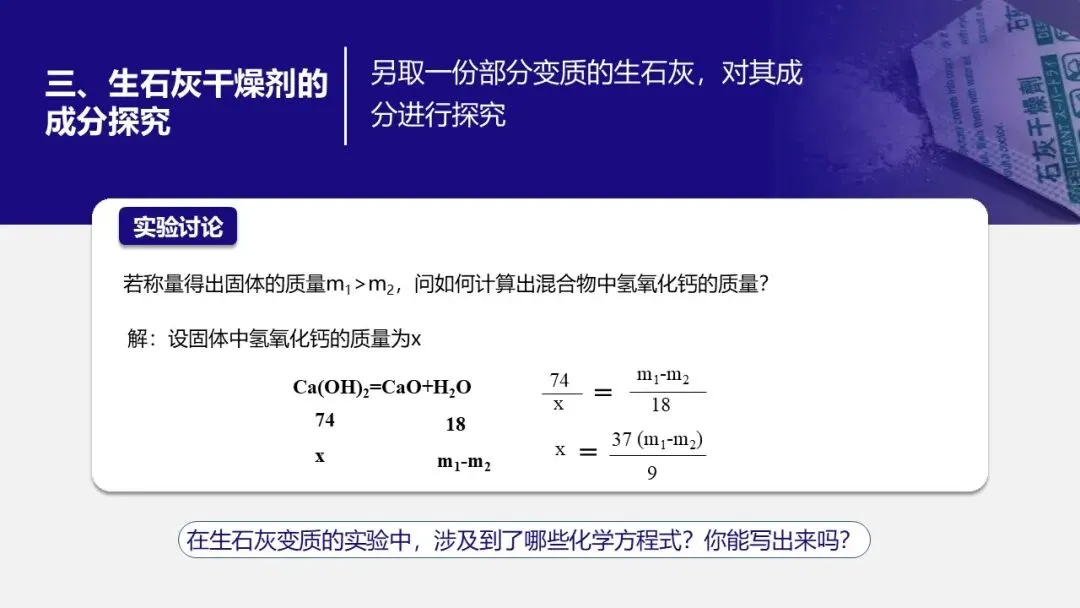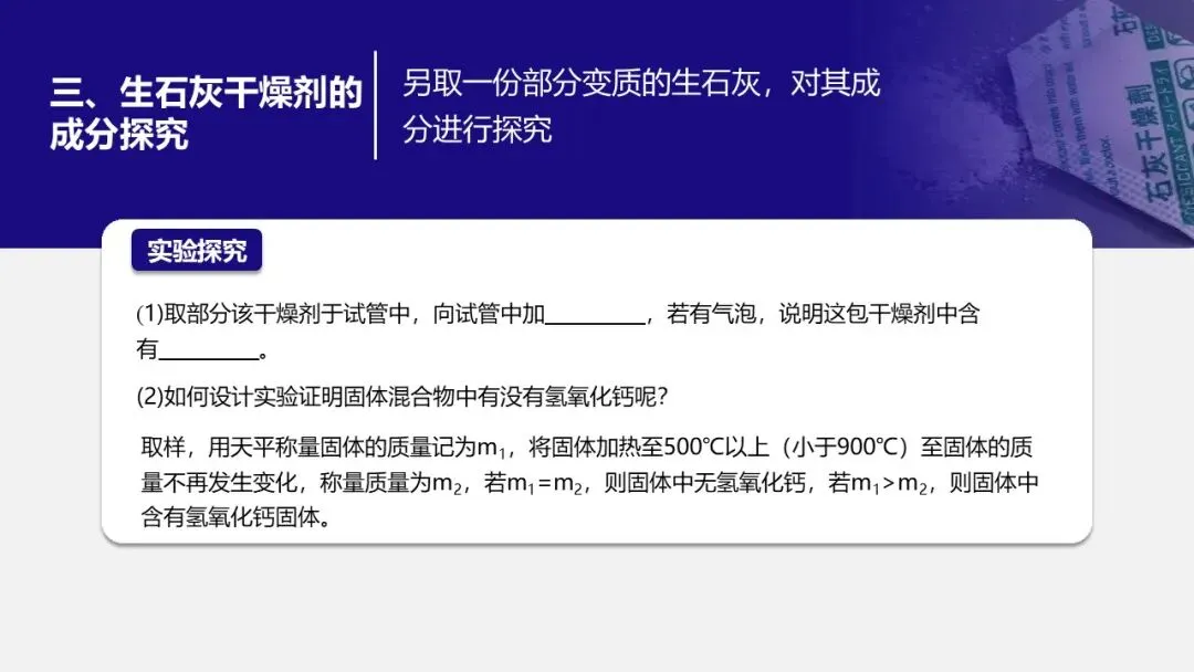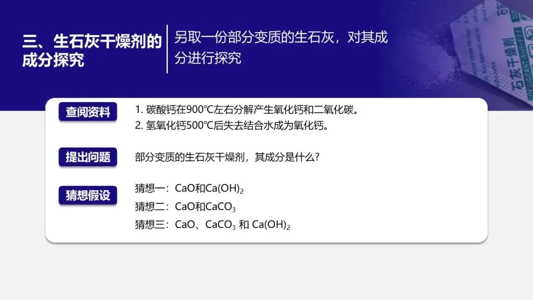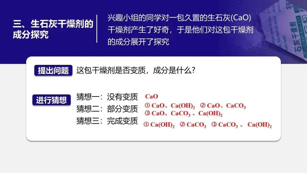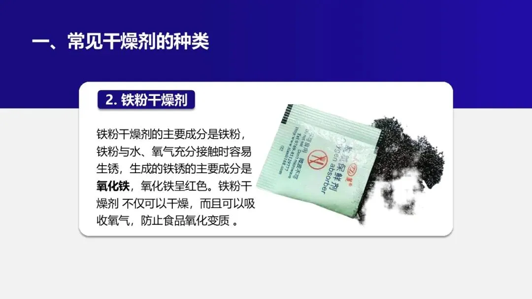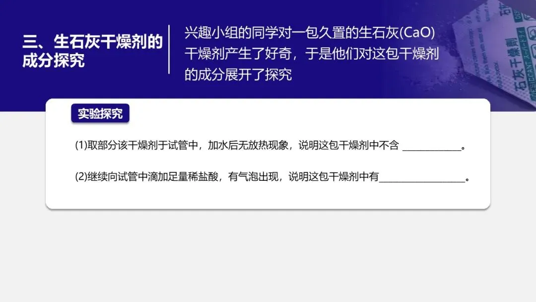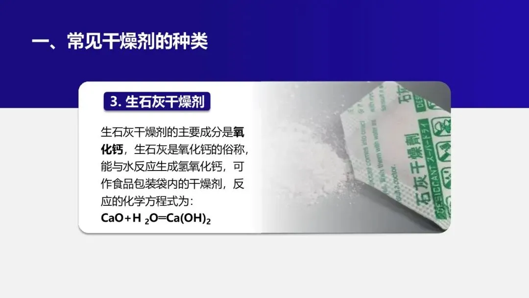教师活动:引导学生分组梳理三种常见干燥剂的核心知识:①硅胶干燥剂(成分:SiO₂,原理:物理吸附水分,无化学变化);②铁粉干燥剂(成分:Fe,原理:4Fe+3O₂+2H₂O=2Fe₂O₃・H₂O,兼具干燥和脱氧功能);③生石灰干燥剂(成分:CaO,原理:CaO+H₂O=Ca (OH)₂,仅干燥功能)。强调化学变化与物理变化的区别,书写相关化学方程式。