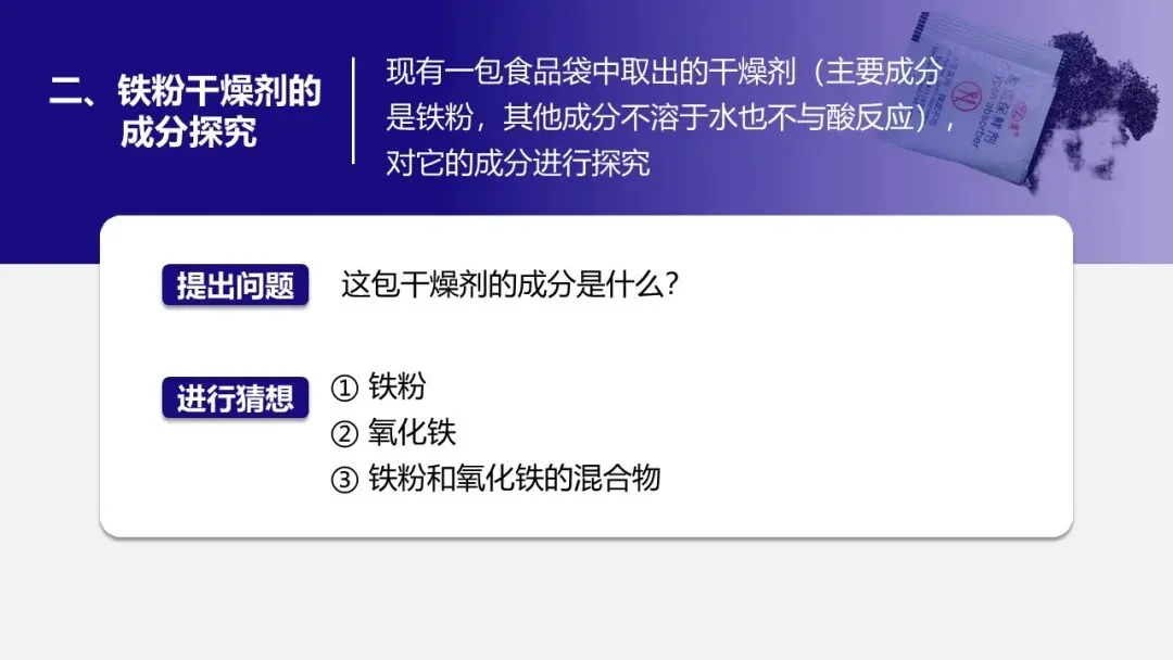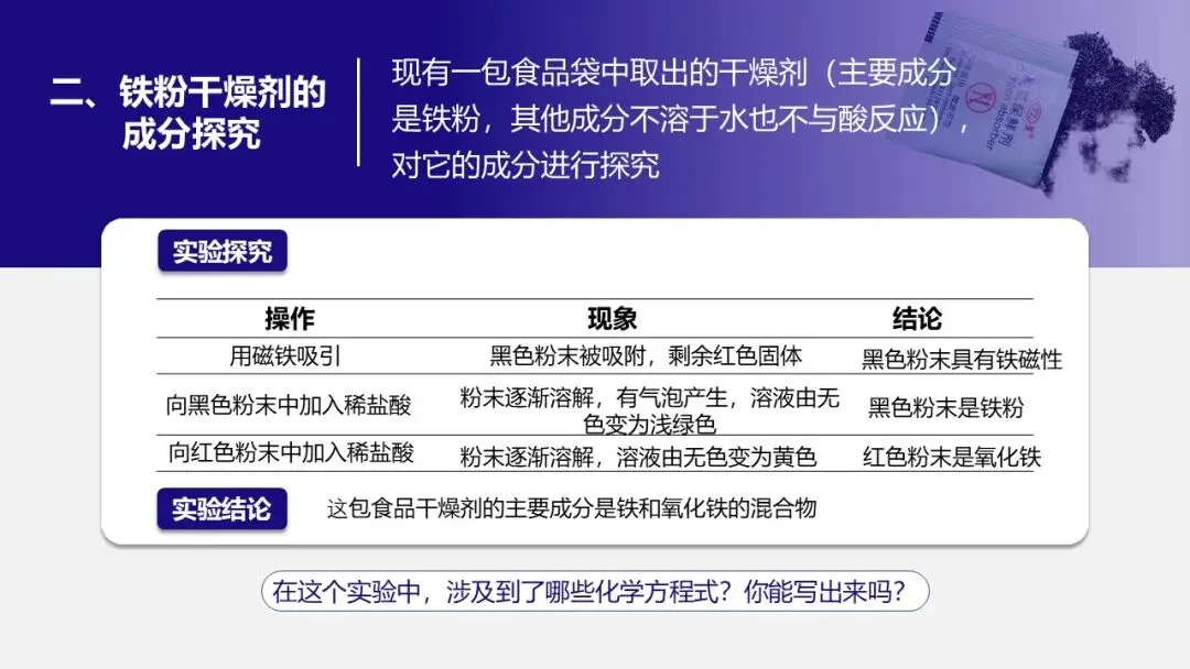 设计意图:以铁粉干燥剂为载体,强化金属与金属氧化物的化学性质,掌握 “单一物质成分探究” 的基本思路。