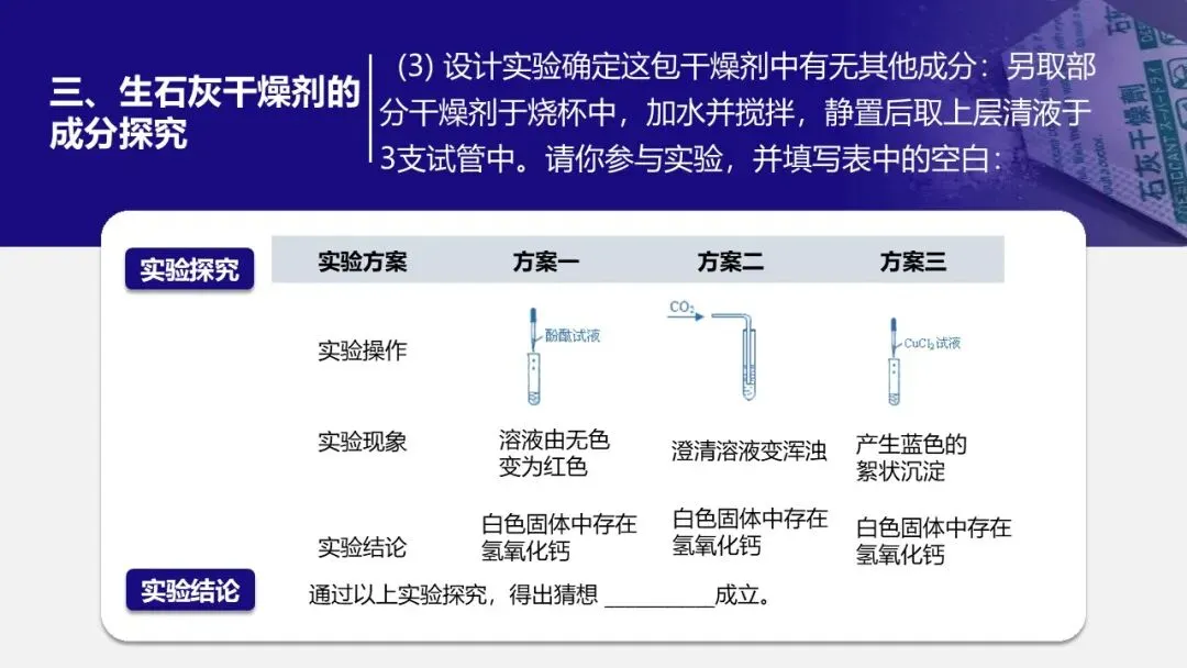 教师活动:指导学生设计分步验证方案:①检验 CaO:取少量干燥剂加水,若放热则含 CaO(无放热则不含);②检验 CaCO₃:加足量稀盐酸,若产生气泡则含 CaCO₃;③检验 Ca (OH)₂:取上层清液,滴加酚酞试液(变红)、或通入 CO₂(变浑浊)、或加 CuCl₂溶液(生成蓝色沉淀)。强调 “先检验 CaO,再检验 CaCO₃和 Ca (OH)₂” 的顺序,排除干扰。