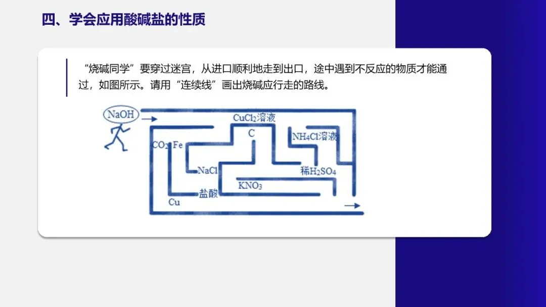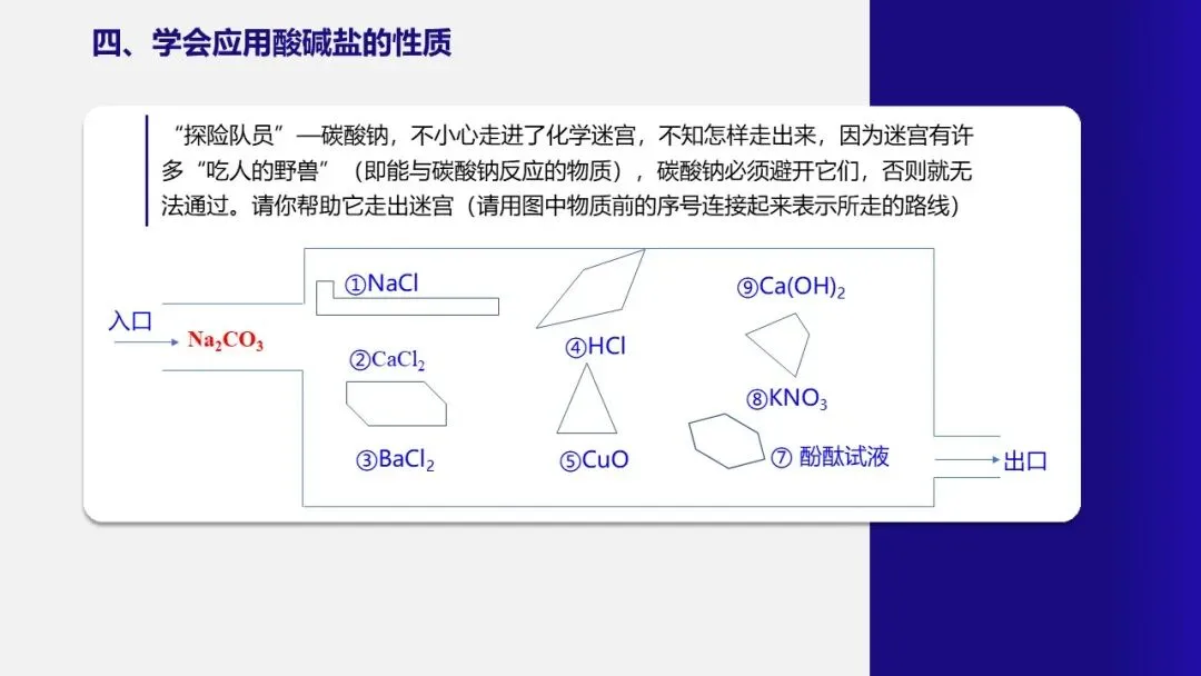 教师活动:展示 “碳酸钠迷宫”“烧碱迷宫”,引导学生利用酸碱盐的反应性质,找出不与碳酸钠、烧碱反应的物质路线(如碳酸钠避开 BaCl₂、Ca (OH)₂、HCl 等),强化酸碱盐的反应规律。