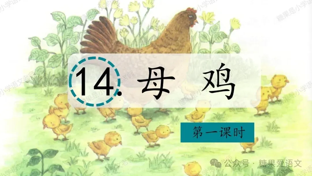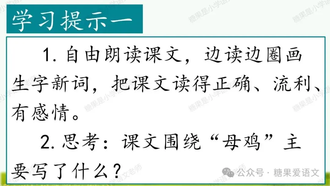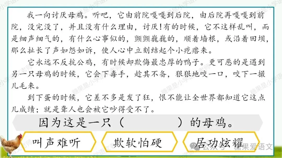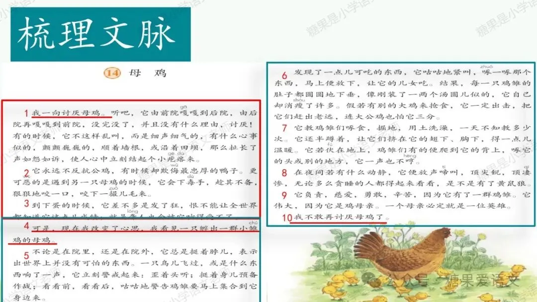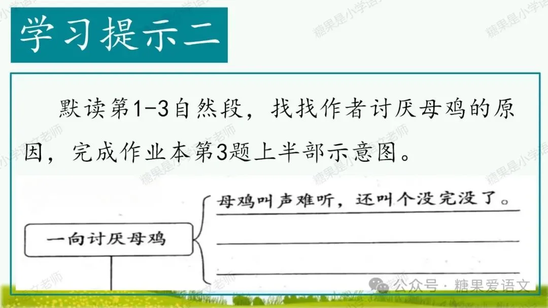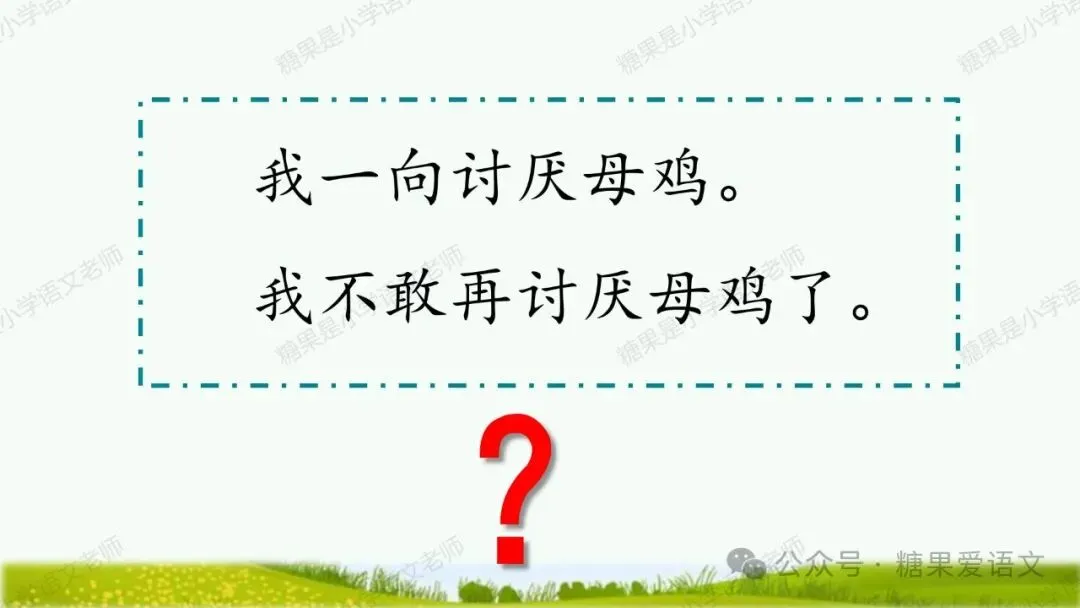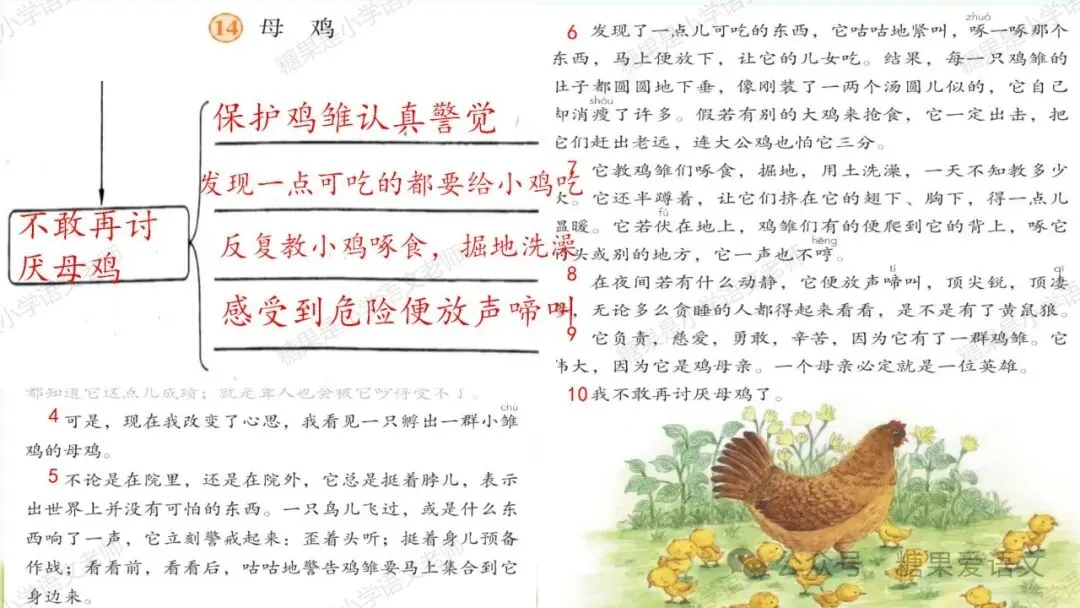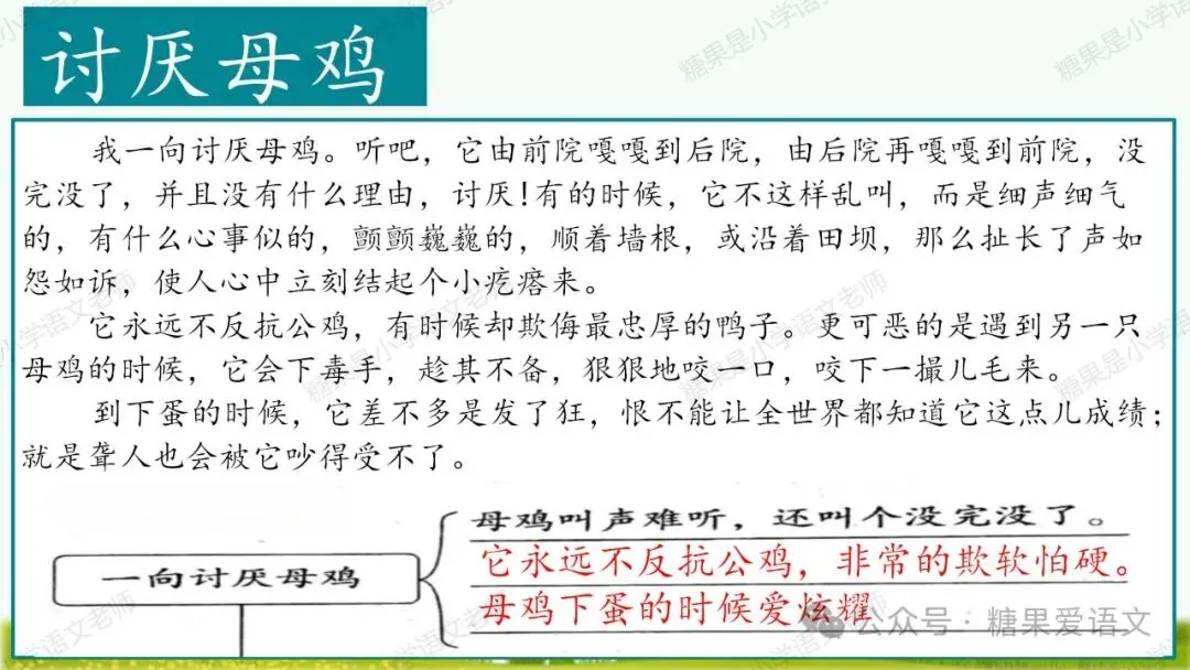 14.母鸡教学目标:1.认识“疙、瘩”等9个生字,读准多音字“恶”,会写“讨、厌”等15个字,会写“理由、心事”等10个词语。 2.默读课文,了解“我”对母鸡态度前后的变化,并说出变化的原因。 3.感受母鸡的“负责、慈爱、勇敢、辛苦”,体会母爱的伟大。 4.通过比较,感受同一作家在写不同动物时,表达上的相同和不同之处。 教学重难点: 体会作者对母鸡态度的变化,感受母鸡的特点。 教学安排:2课时 教学准备:ppt 教学流程: 第1课时教学目标:1.认识“疙、瘩”等9个生字,读准多音字“恶”,会写“讨、厌”等15个字,会写“理由、心事”等10个词语。 2.默读课文,了解“我”对母鸡态度前后的变化。 3.重点学习1-3自然段,了解母鸡令人讨厌的原因。 教学过程: 一、走进文本,初识母鸡1.孩子们,这个单元我们走进了“我的动物朋友”,认识了古怪的大猫和淘气的小猫。这节课呀,我们要一起走进老舍先生另一篇描写动物的散文《母鸡》,请同学们来读课题。 课件出示:课题 2.通过预习,你们知道老舍先生对母鸡态度是怎么样的? 预设:刚开始是很讨厌的,后面不敢讨厌了。 是啊,文中有这样两句话直接表达了他的的情感,我们一起来读。 课件出示: 我一向讨厌母鸡。 我不敢再讨厌母鸡了。 是的,起先是一向讨厌,后来不敢再讨厌了,怎么回事呢?出示:问号 赶紧打开书读读课文,找找老舍先生对母鸡的态度180度大转变的原因。 二、初读课文,字词过关1. 请同学们自由朗读课文,边读边圈画生字新词,把课文读得正确、流利、有感情。边读边思考:课文围绕“母鸡”主要写了什么? 课件出示: 1.自由朗读课文,边读边圈画生字新词,把课文读得正确、流利、有感情。 2.边读边思考:课文围绕“母鸡”主要写了什么? 2. 我们来读读这些生字。 课件出示:检测字词 请你读一读第一组词语,说说你发现了什么? 预设:第一组都是形容母鸡啼叫的词语。 预设:“嘎嘎、咕咕”都是拟声词; 预设:“颤颤巍巍、如怨如诉”都是形容母鸡叫声的状态。 补充:文中像“如怨如诉”这种ABAC形式的词语:没完没了、细声细气,也是形容母鸡的叫声的。 请同学们读一读,感受母鸡的啼叫声。 第二组词语呢? 预设:第二组词语都是儿化音。 是啊,老舍先生是北京人,他的很多文章里都带有儿化音,我们试着读好它。 这里还有一个多音字,谁能来读读。 课件出示:多音字 现在请同学们完成作业本练习。 课件出示:作业本第2题 3.现在让我们回到课文,从开始的“一向讨厌”到后来的“不敢再讨厌”,老舍先生对母鸡的态度是从哪里开始变化的呢? 预设:第4自然段(课件横线画出) 追问:你发现了什么? 预设:是过渡段,在文中起到承上启下的作用。 找到了过渡段,还有首尾的关键句,课文的结构便清晰地展现在我们眼前,你还发现了什么? 预设:前面的三个自然段写作者讨厌母鸡,从第4自然段开始到末尾,写作者不敢再讨厌母鸡。课件出示:框出1-3自然段,动画框出4-10自然段 看看画横线的三句话,谁能说说课文围绕“母鸡”写了什么? 预设:作者本来很讨厌母鸡,但他看见一只孵出一群鸡群的母鸡,他对他一开始很讨厌的母鸡,但是看到这只母鸡后他改变了他的心思,变得不再讨厌母鸡了。 小结:是啊,抓住了关键句,我就能这么长的文章读成几句话,我们在概括主要内容的时候就可以用上这样的方法。 三、研读段落,感悟“讨厌”1. 老舍为什么讨厌母鸡?我们先来研读课文的第1-3自然段。请大家默读第1-3自然段,找找作者讨厌母鸡的原因,完成作业本第3题上半部示意图。注意:默读要做到不出声,不指读,圈点勾画。 课件出示: 默读第1-3自然段,找找作者讨厌母鸡的原因,完成作业本第3题上半部示意图。 2. 交流展示,体会“讨厌” 好的,孩子们。我们一起来交流,作者讨厌母鸡的是第一件事是什么?请同学们跟我看到第一自然段。 预设:母鸡的叫声很不好听,也是无病呻吟。 点拨:好的,第一件事情,孩子们找到了一只叫声难听的母鸡。接着来,作者讨厌母鸡的第二件事是? 预设:它永远不反抗公鸡,而且这只母鸡它非常的欺软怕硬。 预设:第三件事是说这只母鸡是一只人群中炫耀显摆的母鸡。 师:孩子们,你们看三个段落的三件事情。你们的作业本都填对了吗?意思相近即可。 课件出示:作业本第3题上半部分答案 3.咱们一件一件来看,先听听这叫声有多难听。请同学们自由朗读课文第1自然段,请同学们来交流学习体会。 (1)母鸡的叫声是怎样的? 预设:嘎嘎。动画圈出嘎嘎 咱们来听听这嘎嘎声是什么样子的。(播放音频)什么感觉? 预设:很烦人感觉。 预设:感觉很烦躁。 点拨:这烦躁的叫声,在你吃饭的时候的叫,在你写作业的时候它在叫,在你睡觉的时候它还在叫,一个词叫? 预设:没完没了。课件圈出没完没了 这没完没了的嘎嘎声,真是讨厌。你能借助下面的句式说说吗? 设:这一只叫声难听的母鸡,令人心烦。 出示文字: 这是一只()的母鸡,令人()。 (2)是啊,这没完没了的嘎嘎声真是讨厌。有的时候,它还发出另外一种讨厌的叫法,说说看。 预设:有的时候,它不这样乱叫,而是细声细气的,有什么心事似的,颤颤巍巍的,顺着墙根,或沿着田坝,那么扯长了声如怨如诉,使人心中立刻结起个小疙瘩来。这句话的这个声音让我感到很烦躁。(课件出示) 追问:句中的“颤颤巍巍”、“如怨如诉”都形容母鸡的声音,他们有什么区别? 预设:颤颤巍巍是形