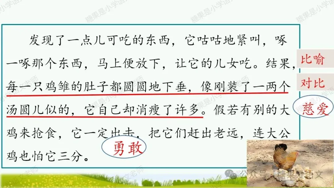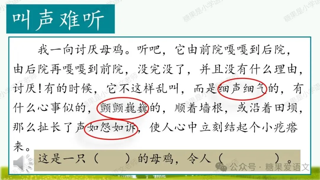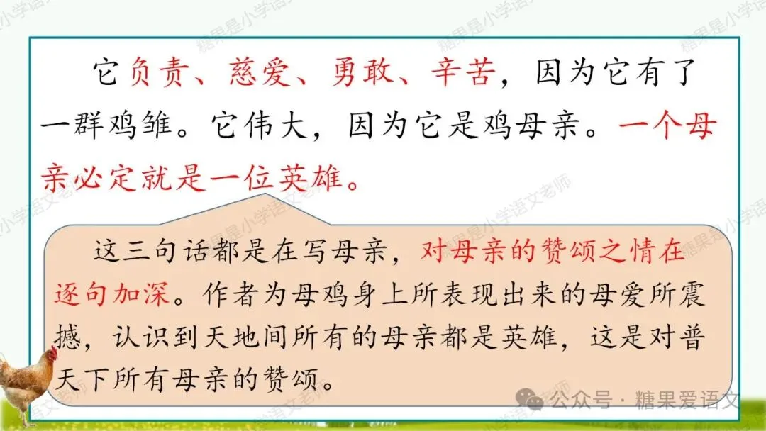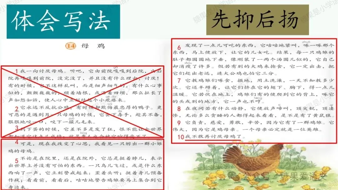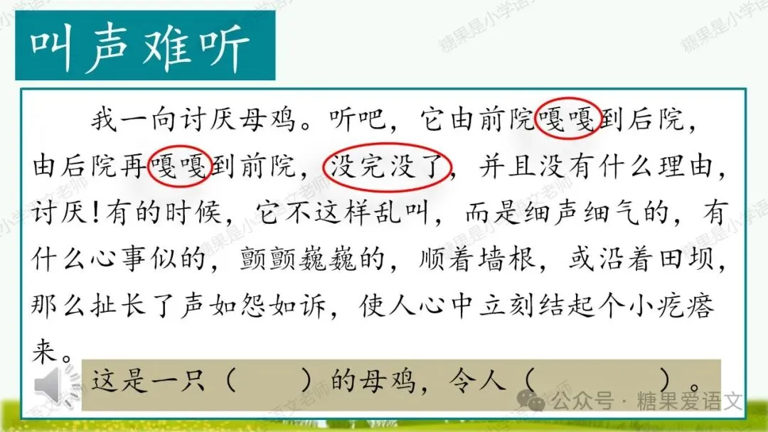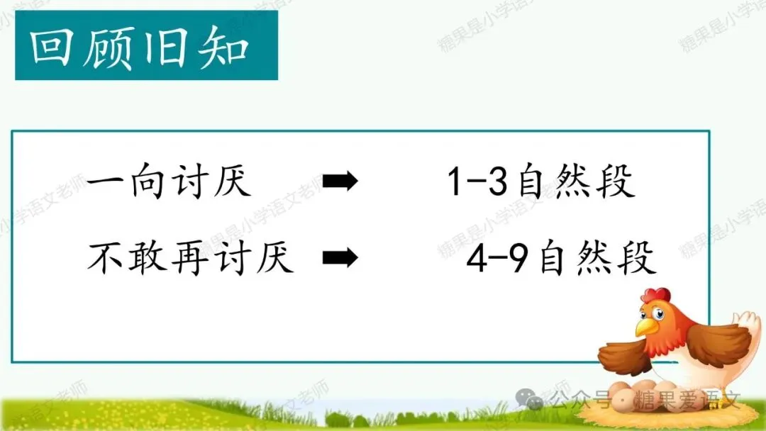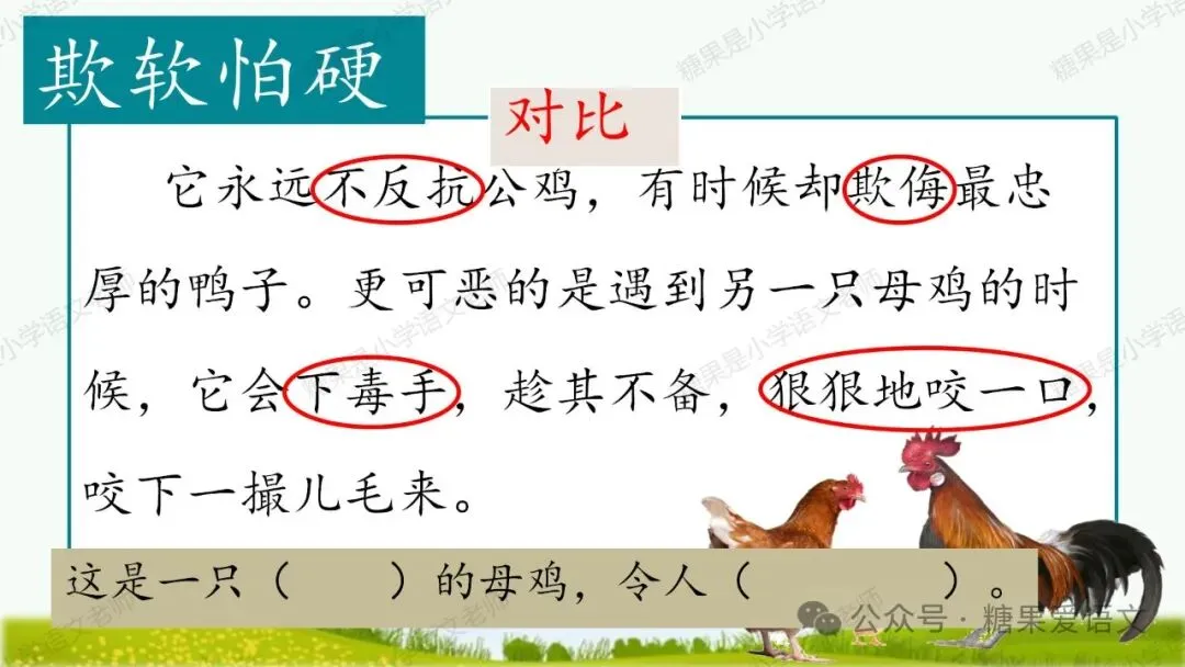 14.母鸡教学目标:1.认识“疙、瘩”等9个生字,读准多音字“恶”,会写“讨、厌”等15个字,会写“理由、心事”等10个词语。 2.默读课文,了解“我”对母鸡态度前后的变化,并说出变化的原因。 3.感受母鸡的“负责、慈爱、勇敢、辛苦”,体会母爱的伟大。 4.通过比较,感受同一作家在写不同动物时,表达上的相同和不同之处。 教学重难点: 体会作者对母鸡态度的变化,感受母鸡的特点。 教学安排:2课时 教学准备:ppt 教学流程: 第1课时教学目标:1.认识“疙、瘩”等9个生字,读准多音字“恶”,会写“讨、厌”等15个字,会写“理由、心事”等10个词语。 2.默读课文,了解“我”对母鸡态度前后的变化。 3.重点学习1-3自然段,了解母鸡令人讨厌的原因。 教学过程: 一、走进文本,初识母鸡1.孩子们,这个单元我们走进了“我的动物朋友”,认识了古怪的大猫和淘气的小猫。这节课呀,我们要一起走进老舍先生另一篇描写动物的散文《母鸡》,请同学们来读课题。 课件出示:课题 2.通过预习,你们知道老舍先生对母鸡态度是怎么样的? 预设:刚开始是很讨厌的,后面不敢讨厌了。 是啊,文中有这样两句话直接表达了他的的情感,我们一起来读。 课件出示: 我一向讨厌母鸡。 我不敢再讨厌母鸡了。 是的,起先是一向讨厌,后来不敢再讨厌了,怎么回事呢?出示:问号 赶紧打开书读读课文,找找老舍先生对母鸡的态度180度大转变的原因。 二、初读课文,字词过关1. 请同学们自由朗读课文,边读边圈画生字新词,把课文读得正确、流利、有感情。边读边思考:课文围绕“母鸡”主要写了什么? 课件出示: 1.自由朗读课文,边读边圈画生字新词,把课文读得正确、流利、有感情。 2.边读边思考:课文围绕“母鸡”主要写了什么? 2. 我们来读读这些生字。 课件出示:检测字词 请你读一读第一组词语,说说你发现了什么? 预设:第一组都是形容母鸡啼叫的词语。 预设:“嘎嘎、咕咕”都是拟声词; 预设:“颤颤巍巍、如怨如诉”都是形容母鸡叫声的状态。 补充:文中像“如怨如诉”这种ABAC形式的词语:没完没了、细声细气,也是形容母鸡的叫声的。 请同学们读一读,感受母鸡的啼叫声。 第二组词语呢? 预设:第二组词语都是儿化音。 是啊,老舍先生是北京人,他的很多文章里都带有儿化音,我们试着读好它。 这里还有一个多音字,谁能来读读。 课件出示:多音字 现在请同学们完成作业本练习。 课件出示:作业本第2题 3.现在让我们回到课文,从开始的“一向讨厌”到后来的“不敢再讨厌”,老舍先生对母鸡的态度是从哪里开始变化的呢? 预设:第4自然段(课件横线画出) 追问:你发现了什么? 预设:是过渡段,在文中起到承上启下的作用。 找到了过渡段,还有首尾的关键句,课文的结构便清晰地展现在我们眼前,你还发现了什么? 预设:前面的三个自然段写作者讨厌母鸡,从第4自然段开始到末尾,写作者不敢再讨厌母鸡。课件出示:框出1-3自然段,动画框出4-10自然段 看看画横线的三句话,谁能说说课文围绕“母鸡”写了什么? 预设:作者本来很讨厌母鸡,但他看见一只孵出一群鸡群的母鸡,他对他一开始很讨厌的母鸡,但是看到这只母鸡后他改变了他的心思,变得不再讨厌母鸡了。 小结:是啊,抓住了关键句,我就能这么长的文章读成几句话,我们在概括主要内容的时候就可以用上这样的方法。 三、研读段落,感悟“讨厌”1. 老舍为什么讨厌母鸡?我们先来研读课文的第1-3自然段。请大家默读第1-3自然段,找找作者讨厌母鸡的原因,完成作业本第3题上半部示意图。注意:默读要做到不出声,不指读,圈点勾画。 课件出示: 默读第1-3自然段,找找作者讨厌母鸡的原因,完成作业本第3题上半部示意图。 2. 交流展示,体会“讨厌” 好的,孩子们。我们一起来交流,作者讨厌母鸡的是第一件事是什么?请同学们跟我看到第一自然段。 预设:母鸡的叫声很不好听,也是无病呻吟。 点拨:好的,第一件事情,孩子们找到了一只叫声难听的母鸡。接着来,作者讨厌母鸡的第二件事是? 预设:它永远不反抗公鸡,而且这只母鸡它非常的欺软怕硬。 预设:第三件事是说这只母鸡是一只人群中炫耀显摆的母鸡。 师:孩子们,你们看三个段落的三件事情。你们的作业本都填对了吗?意思相近即可。 课件出示:作业本第3题上半部分答案 3.咱们一件一件来看,先听听这叫声有多难听。请同学们自由朗读课文第1自然段,请同学们来交流学习体会。 (1)母鸡的叫声是怎样的? 预设:嘎嘎。动画圈出嘎嘎 咱们来听听这嘎嘎声是什么样子的。(播放音频)什么感觉? 预设:很烦人感觉。 预设:感觉很烦躁。 点拨:这烦躁的叫声,在你吃饭的时候的叫,在你写作业的时候它在叫,在你睡觉的时候它还在叫,一个词叫? 预设:没完没了。课件圈出没完没了 这没完没了的嘎嘎声,真是讨厌。你能借助下面的句式说说吗? 设:这一只叫声难听的母鸡,令人心烦。 出示文字: 这是一只()的母鸡,令人()。 (2)是啊,这没完没了的嘎嘎声真是讨厌。有的时候,它还发出另外一种讨厌的叫法,说说看。 预设:有的时候,它不这样乱叫,而是细声细气的,有什么心事似的,颤颤巍巍的,顺着墙根,或沿着田坝,那么扯长了声如怨如诉,使人心中立刻结起个小疙瘩来。这句话的这个声音让我感到很烦躁。(课件出示) 追问:句中的“颤颤巍巍”、“如怨如诉”都形容母鸡的声音,他们有什么区别? 预设:颤颤巍巍是形